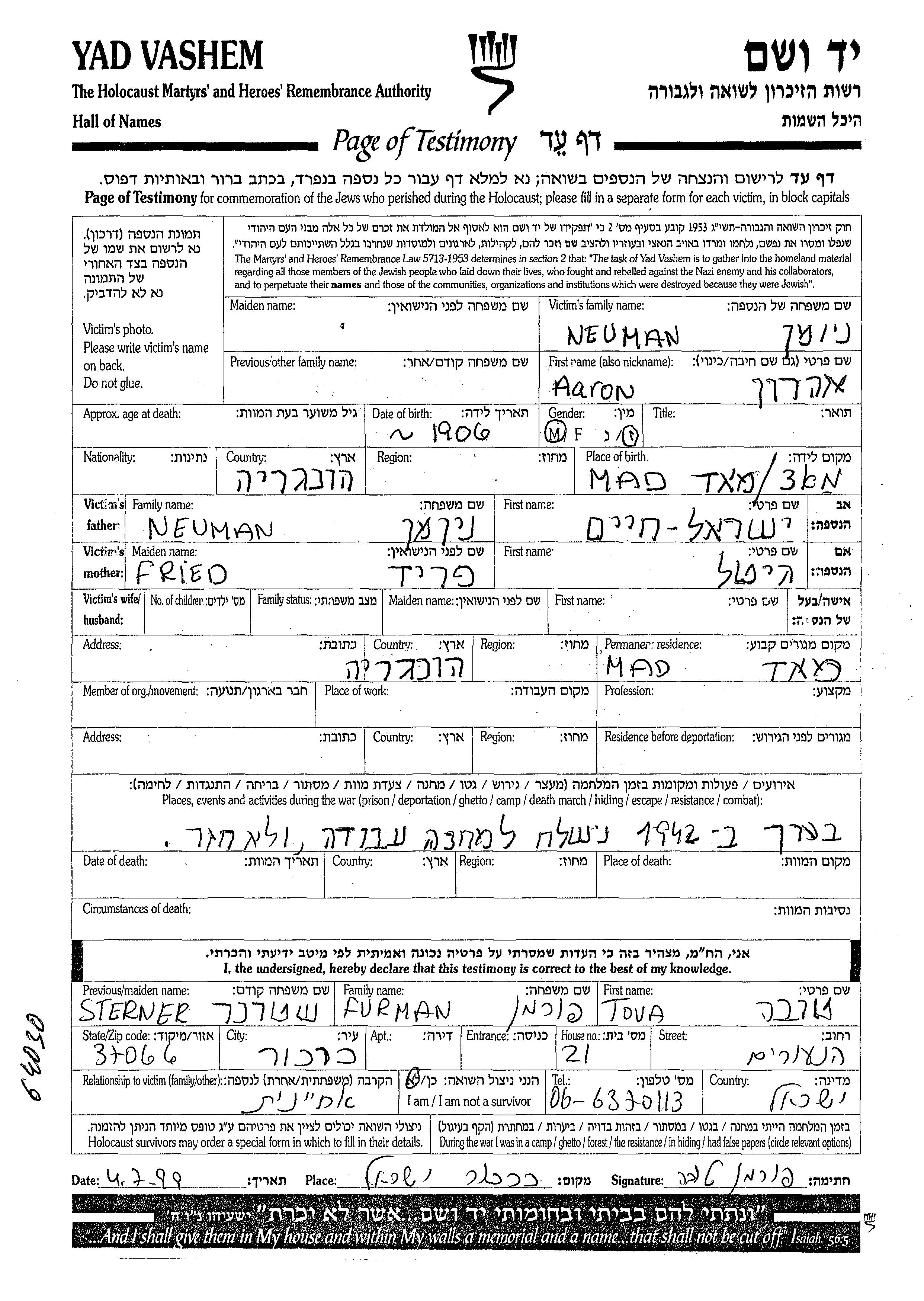 Aaron Neuman נולד בMad שבהונגריה בשנת 1906 לישראל חיים וגיטל. לפני מלחמת העולם השניה התגורר בMad שבהונגריה.