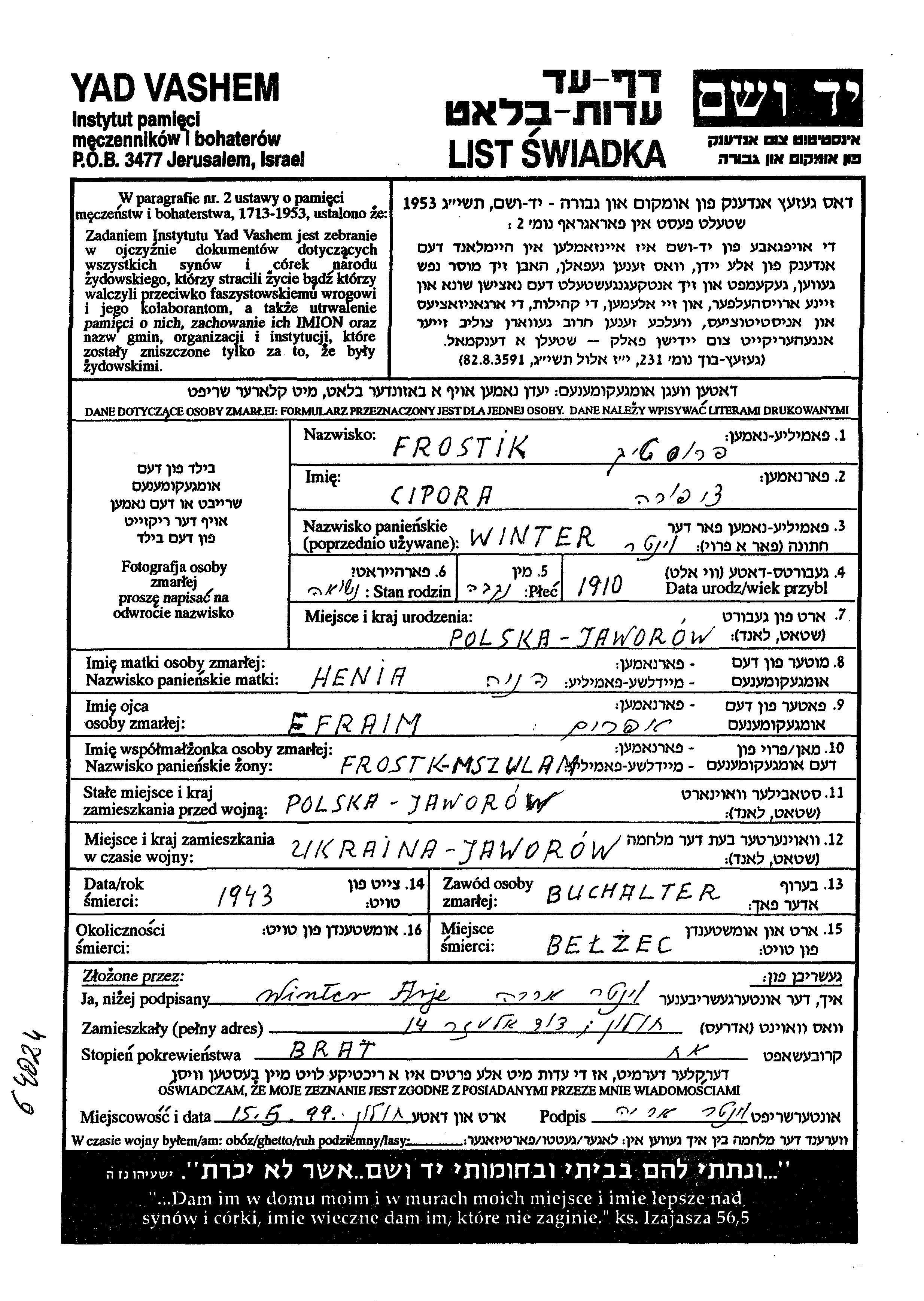 Cipora Frostik לבית Winter נולדה בJaworow שבפולין בשנת 1910 לאפרים וHenia. היא היתה מנהלת חשבונות ונשואה לMszulam. לפני מלחמת העולם השניה התגוררה בJaworow שבפולין. בזמן המלחמה היא היתה בJaworow שבפולין.