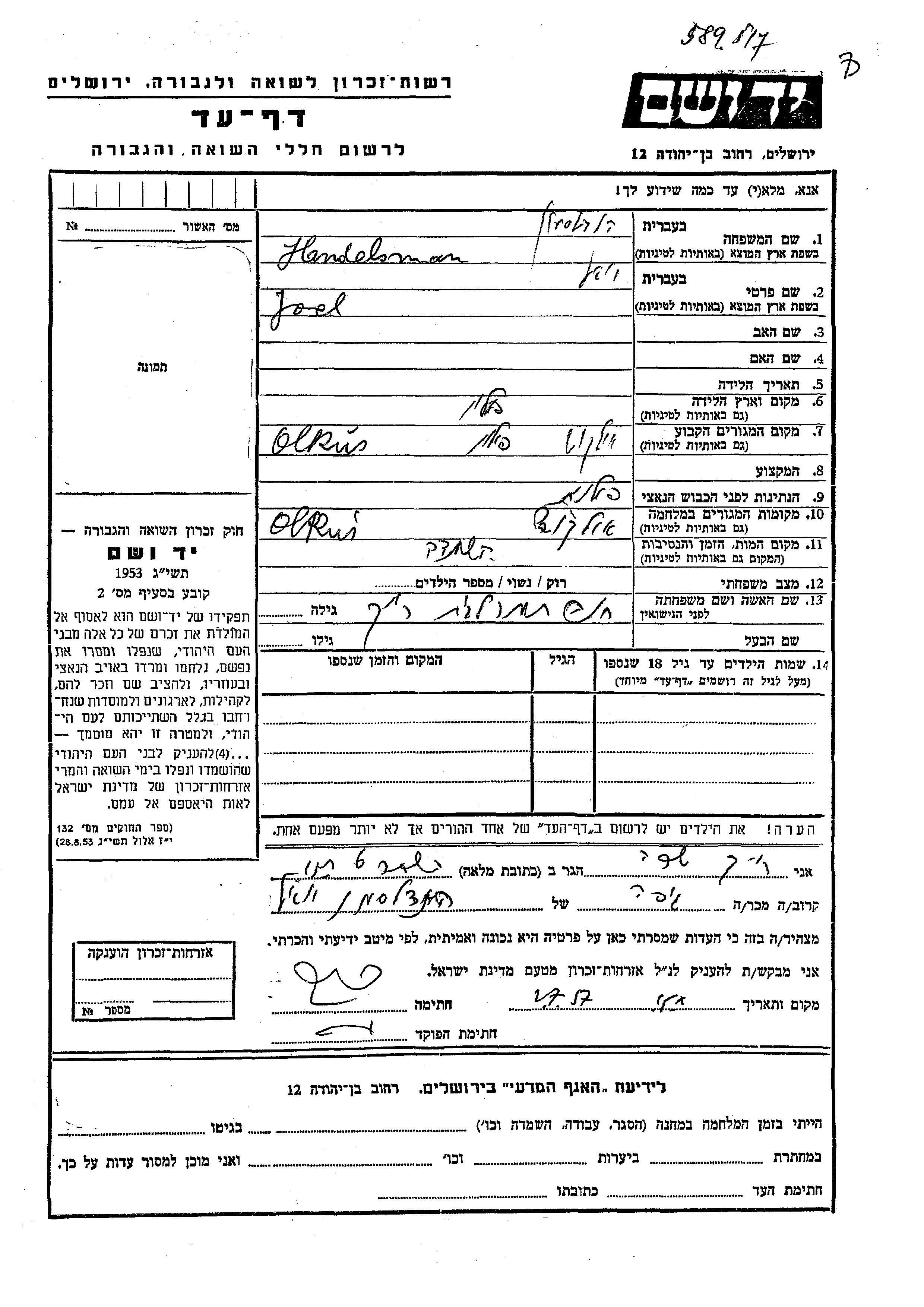 Joel הנדלסמן נולד בפולין. הוא היה נשוי לחנה תמר לבית רייך. לפני מלחמת העולם השניה התגורר בOlkush שבפולין. בזמן המלחמה הוא היה בOlkush שבפולין.