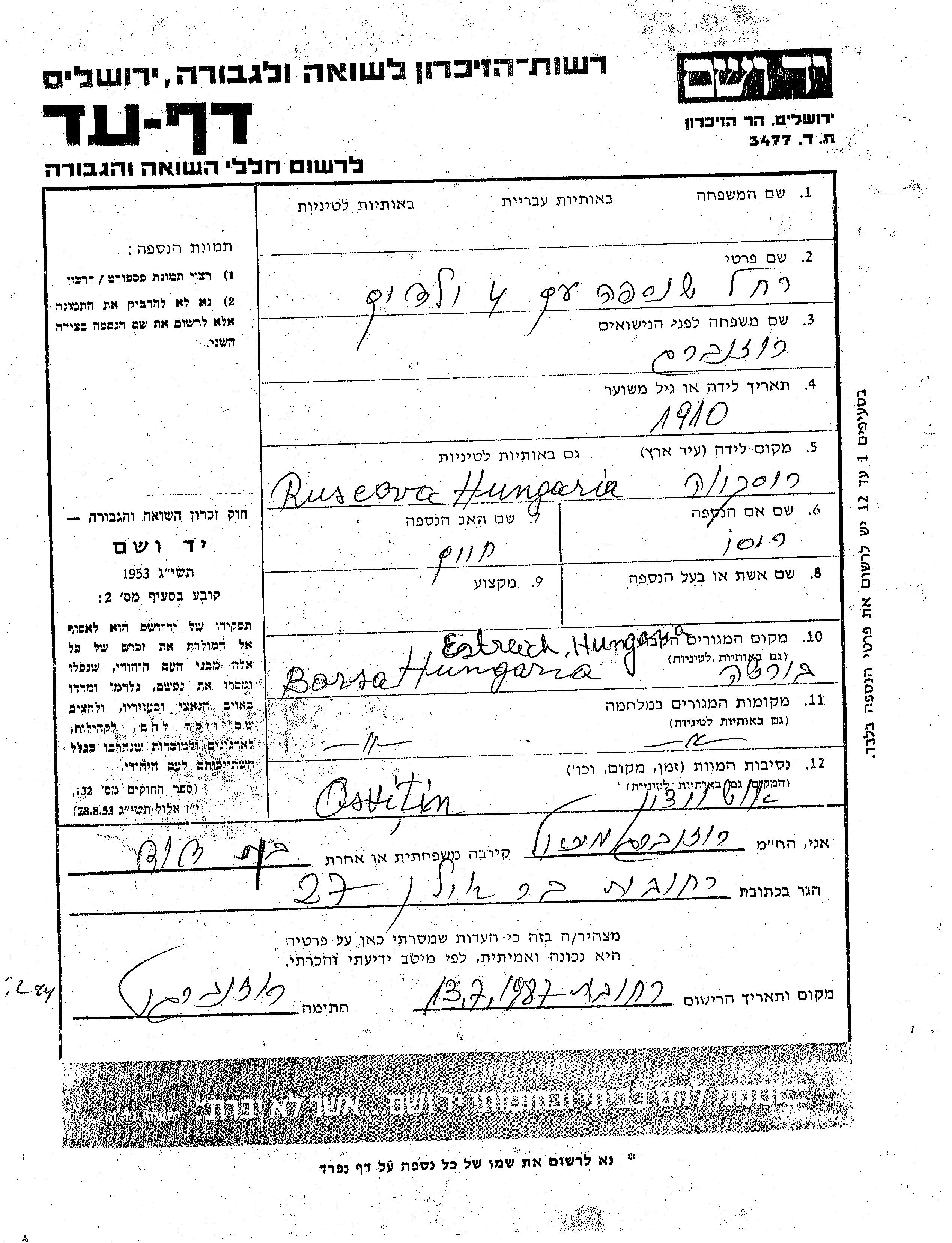 רחל שם משפחה לא ידוע לבית רוזנברג נולדה בRuscova שברומניה בשנת 1910 לחיים וריסו. לפני מלחמת העולם השניה התגוררה בBorsa שברומניה. בזמן המלחמה היא היתה בBorsa שברומניה. רחל נרצחה בשואה. מקום המוות: Auschwitz שבפולין.