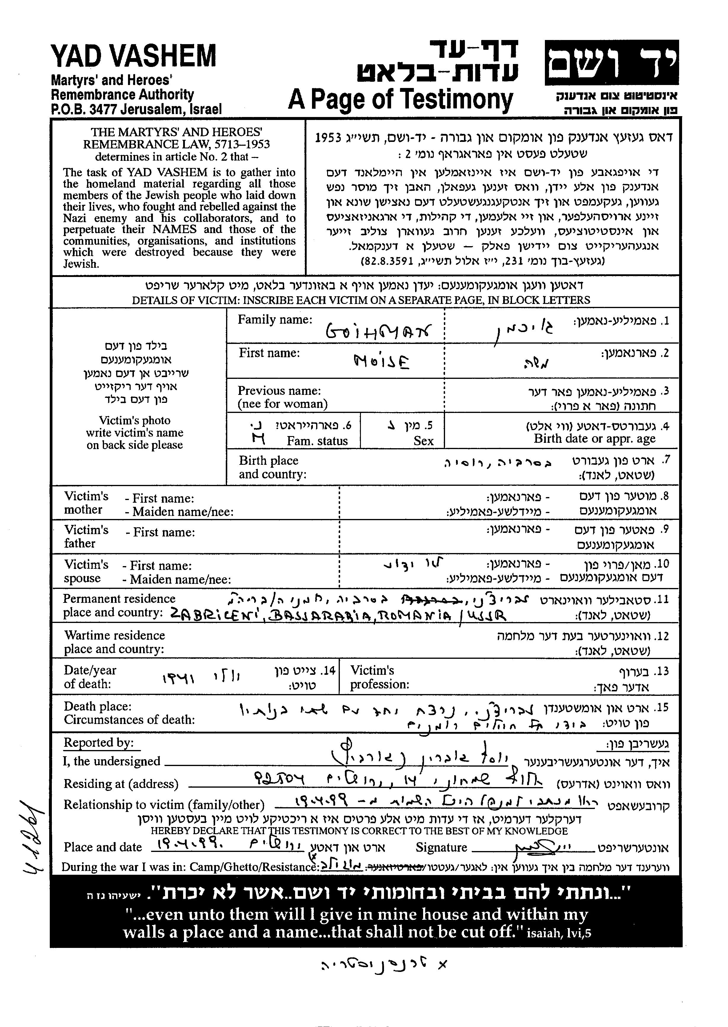 מויסה נרצח בשואה. מקום המוות: Zabriceni שברומניה בשנת 1941.