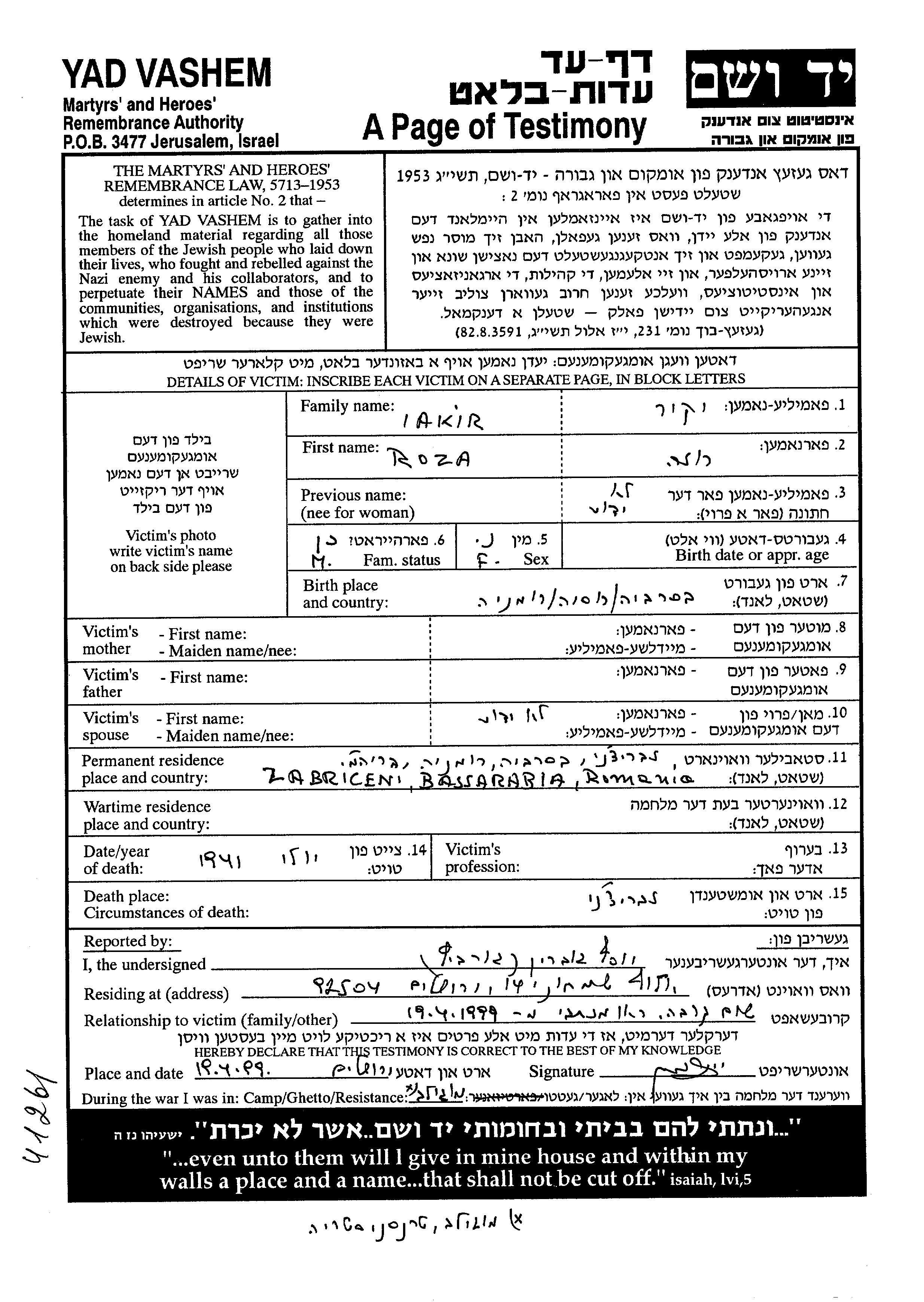 רוזה נרצחה בשואה. מקום המוות: Zabriceni שברומניה בשנת 1941.