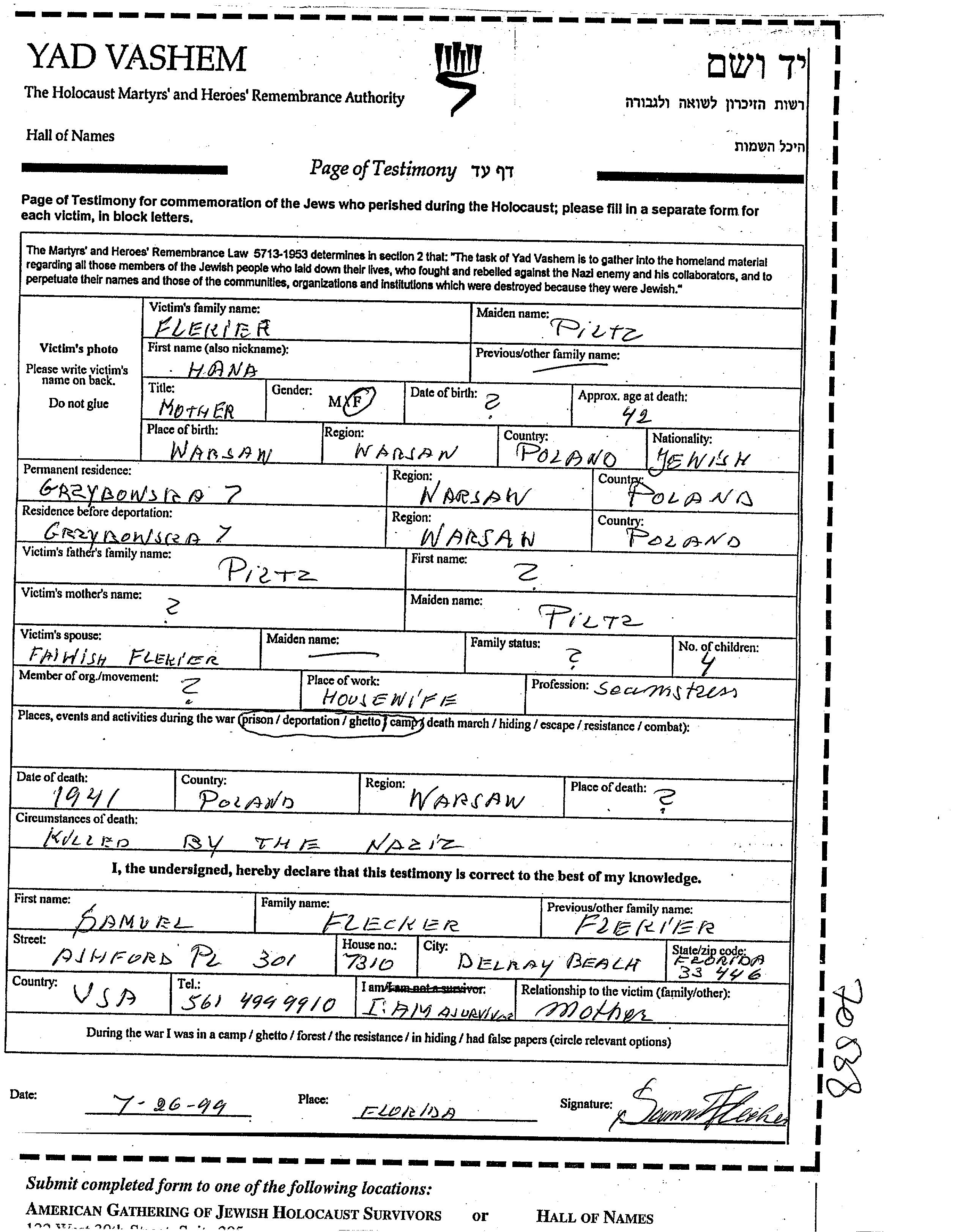 הנה Flekier לבית פילץ נולדה בWarszawa שבפולין. היא היתה תופרת. לפני מלחמת העולם השניה התגוררה בWarszawa שבפולין. בזמן המלחמה היא היתה בWarszawa שבפולין.