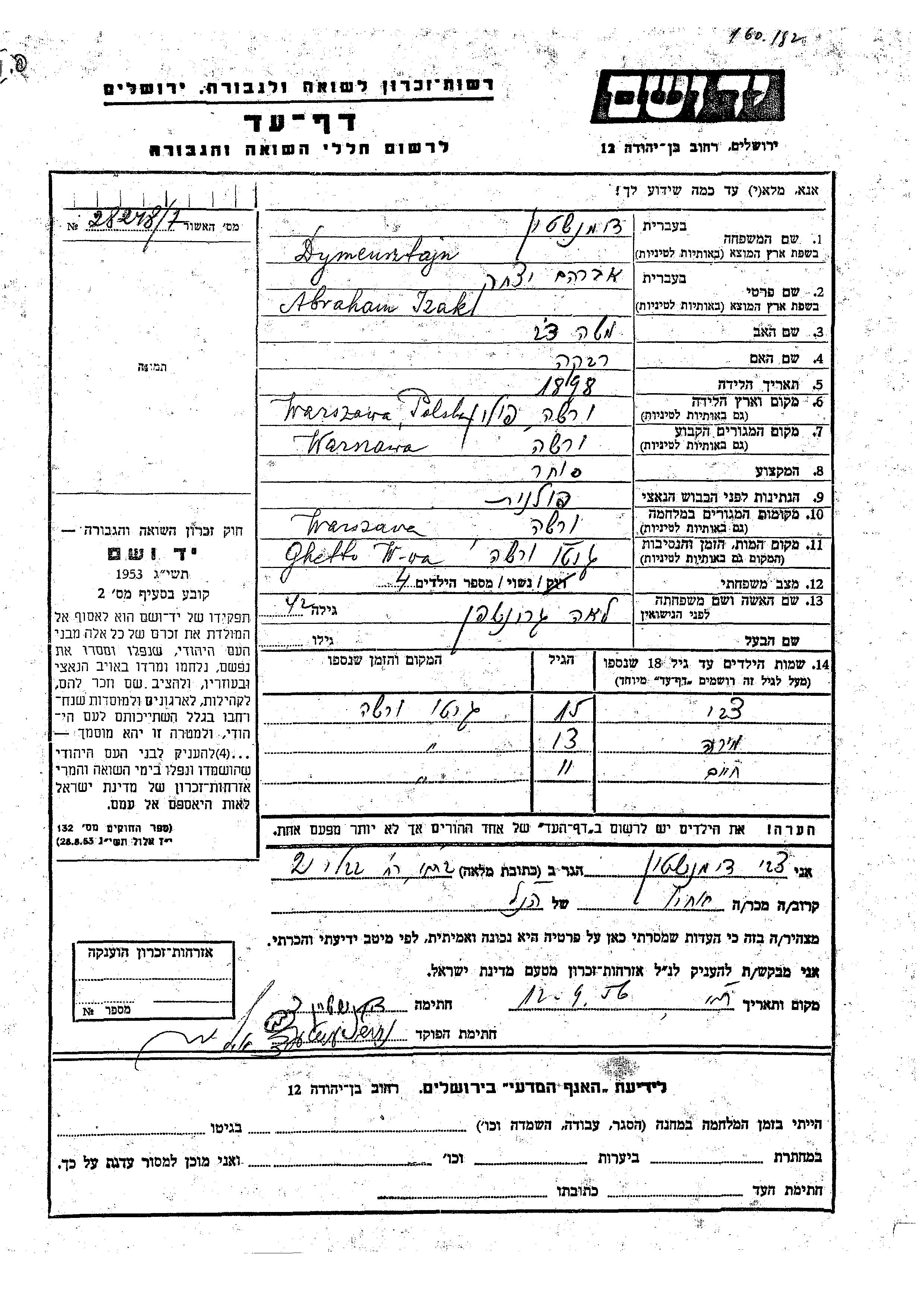 Abraham איזק Dymensztajn נולד בWarszawa שבפולין בשנת 1898 למשה דב ורבקה. הוא היה סוחר ונשוי ללאה לבית גרינשפן. לפני מלחמת העולם השניה התגורר בWarszawa שבפולין. בזמן המלחמה הוא היה בWarszawa שבפולין.