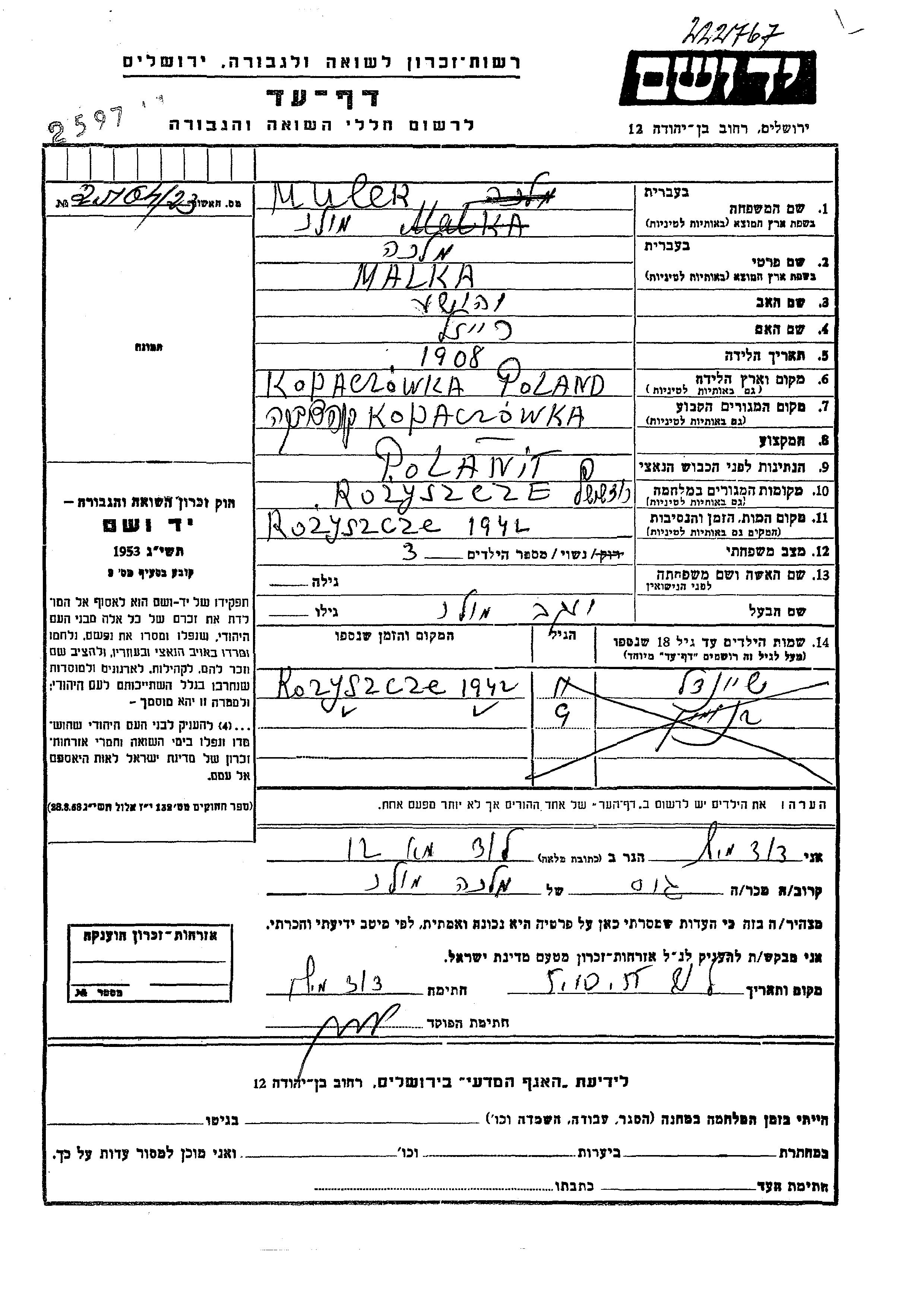 מלכה Muler נולדה בKopaczowka שבפולין בשנת 1908 ליהושע ורייזל. היא היתה נשואה ליעקב. לפני מלחמת העולם השניה התגוררה בKopaczowka שבפולין. בזמן המלחמה היא היתה בRozyszcze שבפולין.