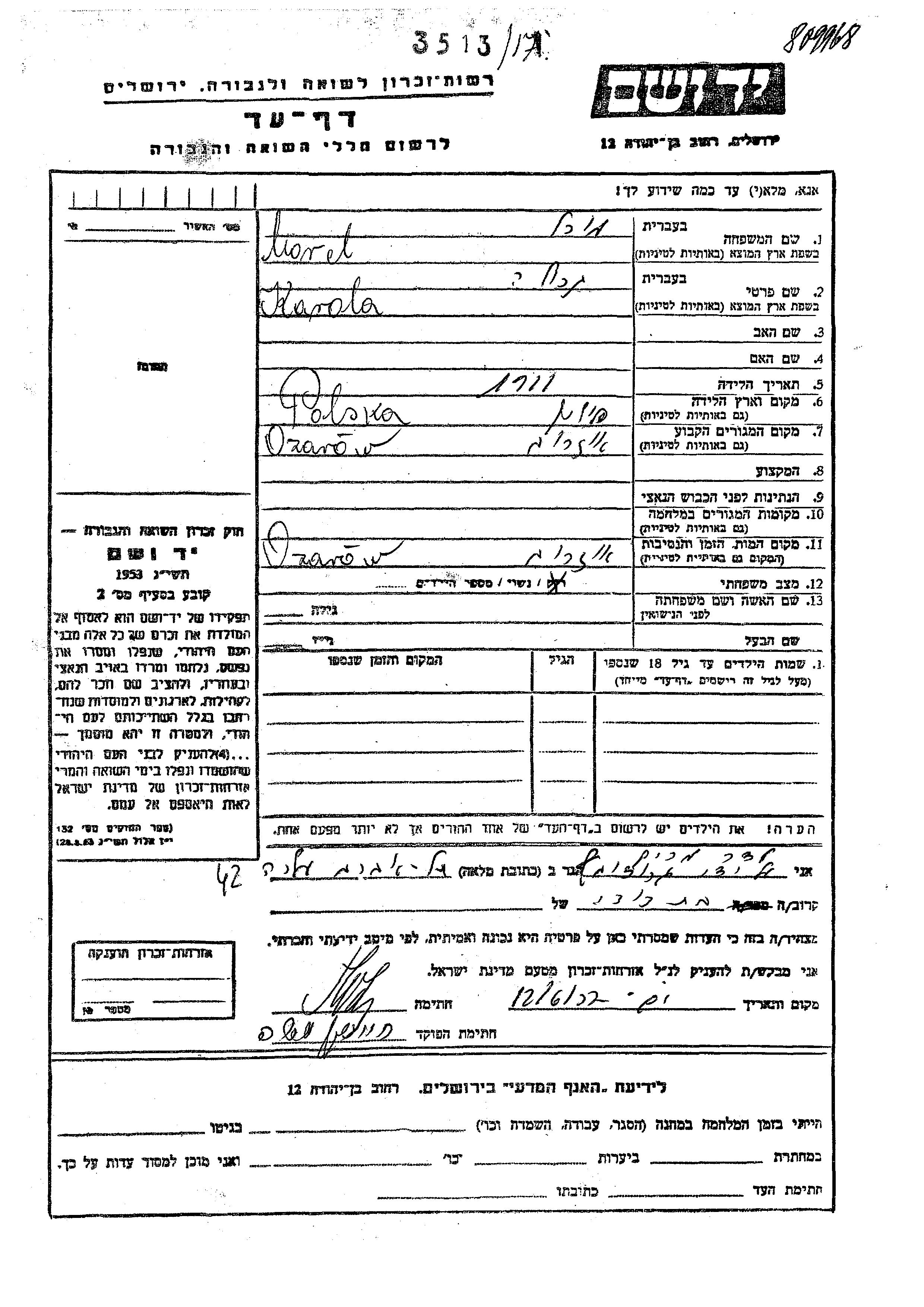 קרולה Morel נולדה בפולין שבפולין בשנת 1911. היא היתה נשואה. לפני מלחמת העולם השניה התגוררה בOzarow שבפולין. קרולה נרצחה בשואה. מקום המוות: Ozarow שבפולין.