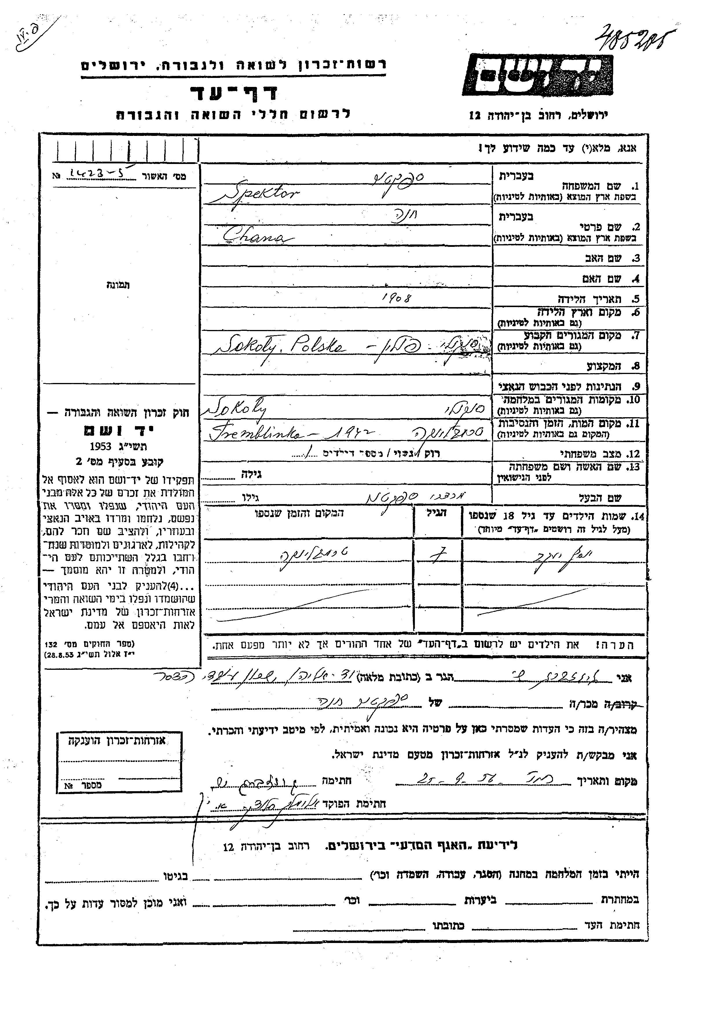 ספקטור חנה 1908 Sokoly, פולין דף-עד