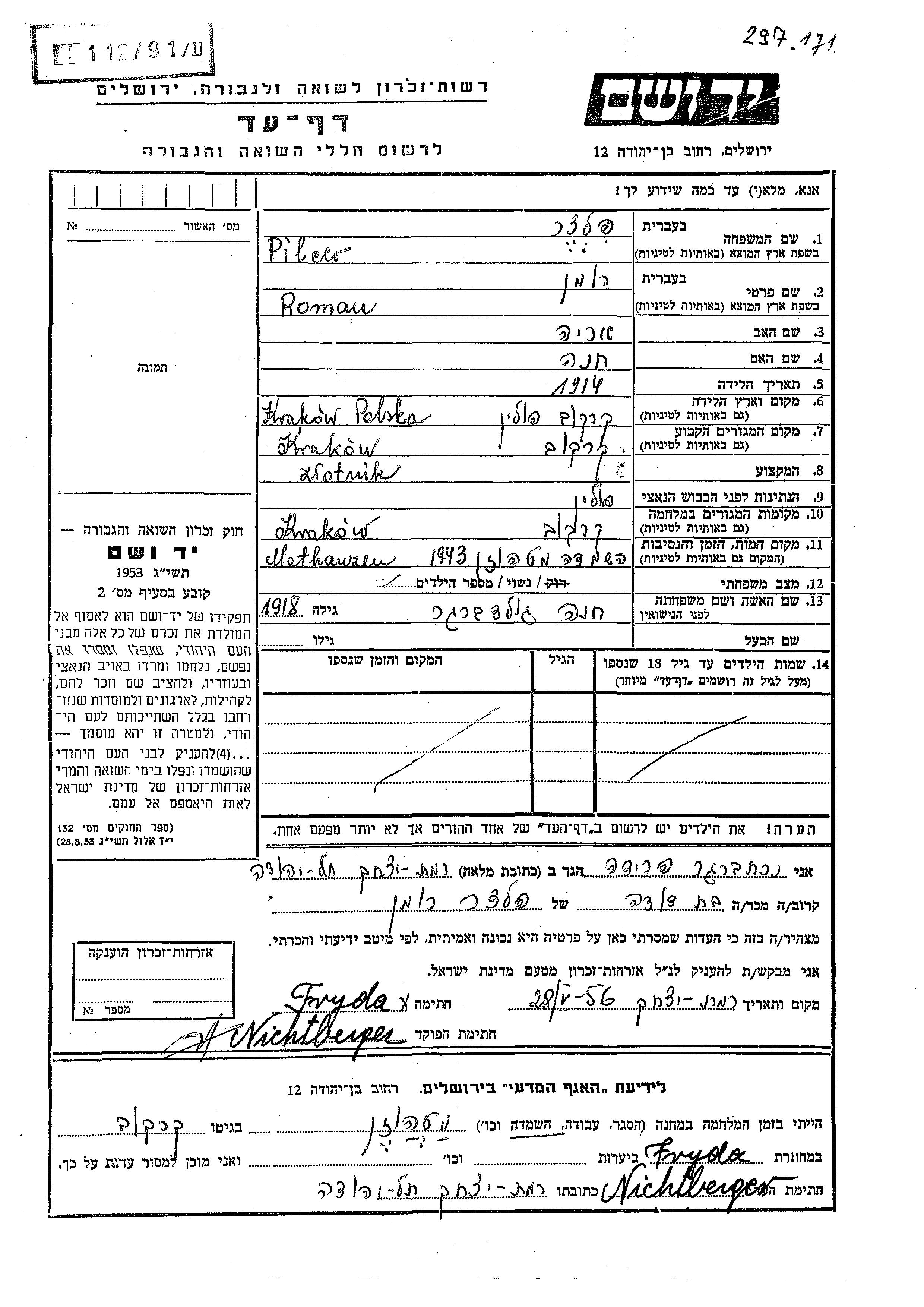רומן Pilcer פלצר נולד בKrakow שבפולין בשנת 1914 לאריה וחנה. הוא היה צורף ונשוי. לפני מלחמת העולם השניה התגורר בKrakow שבפולין. בזמן המלחמה הוא היה בKrakow שבפולין.