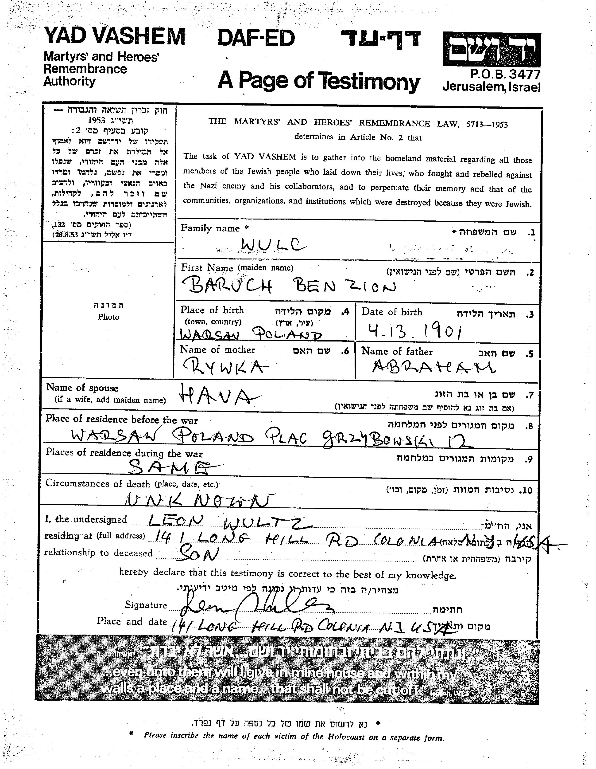 ברוך Ben Zion Wulc נולד בWarsaw שבפולין בשנת 1901 לAbraham וRywka. הוא היה נשוי לHava. לפני מלחמת העולם השניה התגורר בWarsaw שבפולין. בזמן המלחמה הוא היה בWarsaw שבפולין.
