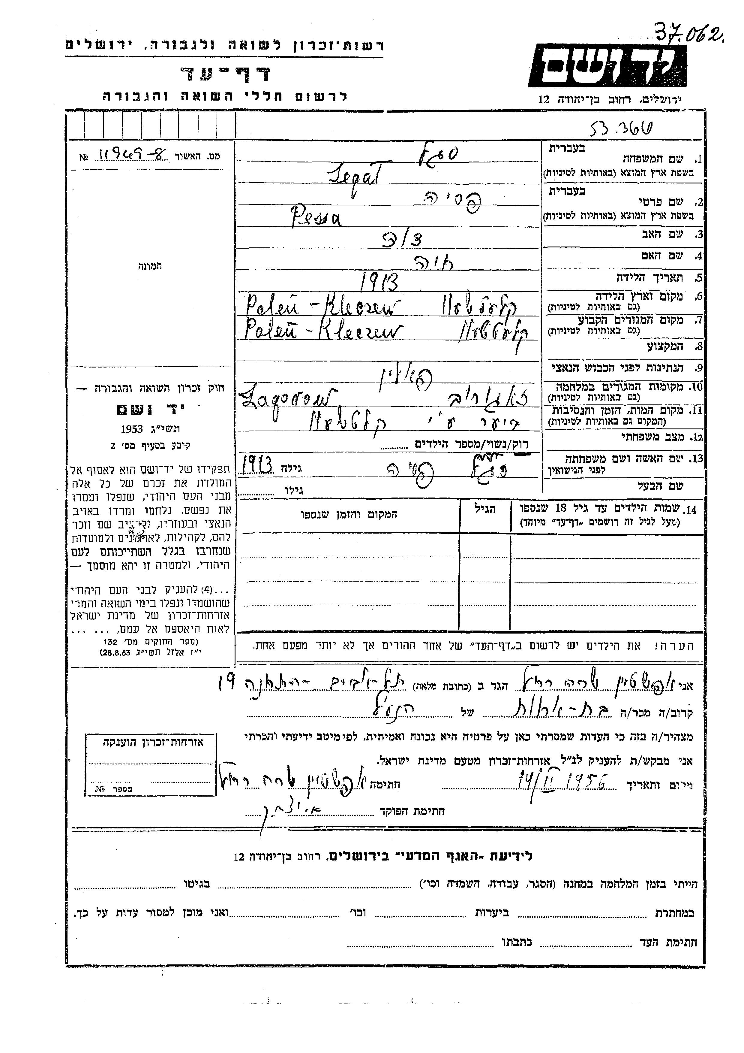 פסיה אגל סגל נולדה בKleczew שבפולין בשנת 1913 לדוד וחיה. לפני מלחמת העולם השניה התגוררה בKleczew שבפולין. בזמן המלחמה היא היתה בZagorow שבפולין. פסיה נרצחה בשואה. מקום המוות: Kleczew שבפולין.