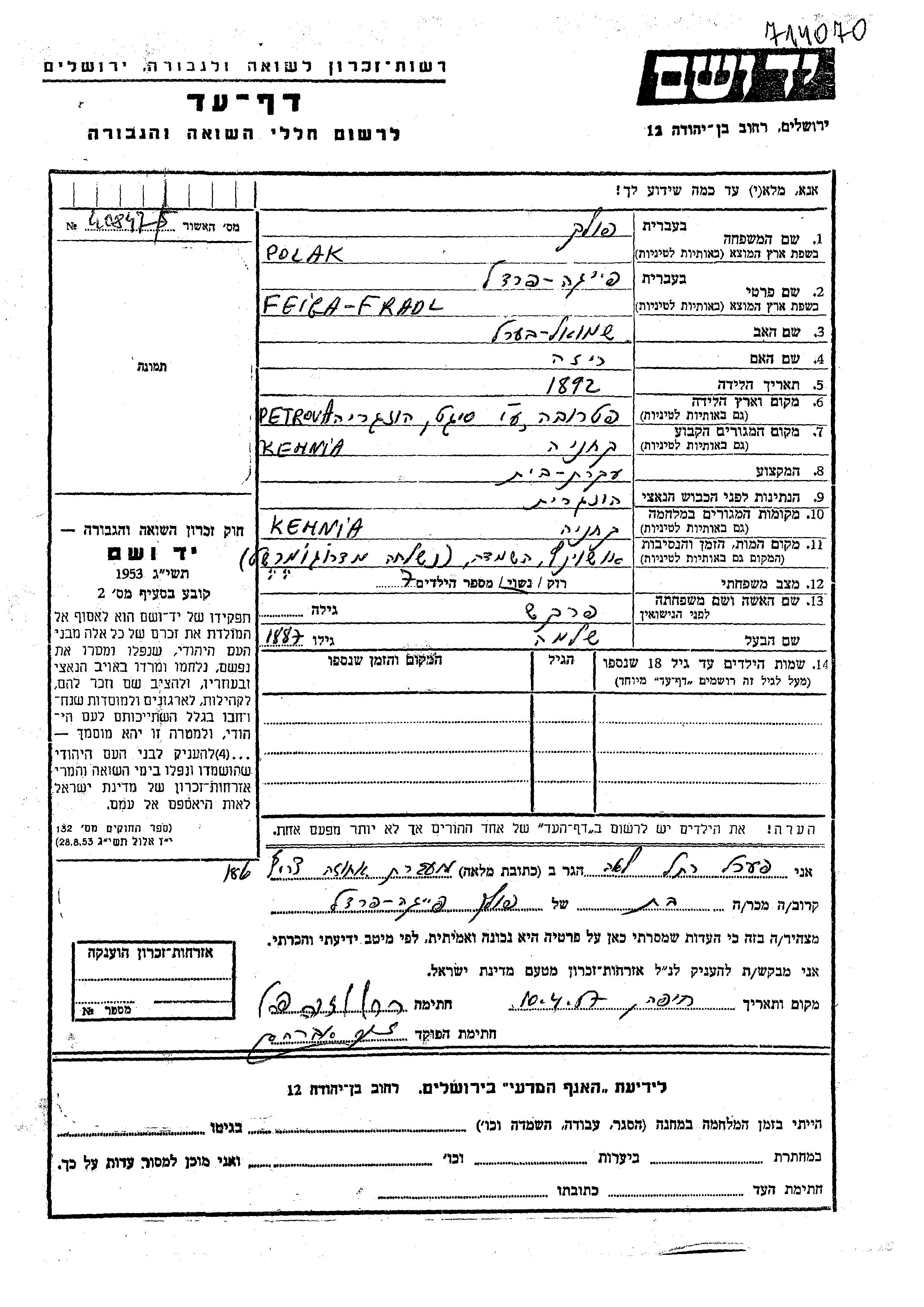 Fradl פייגה פולק לבית פרקש נולדה בPetrova בשנת 1892 לשמואל בערל וריזה. היא היתה עקרת בית ונשואה לשלמה. לפני מלחמת העולם השניה התגוררה בKehnia שברומניה. בזמן המלחמה היא היתה בKehnia שברומניה. היא נרצחה בשואה. מקום המוות: Auschwitz שבפולין.