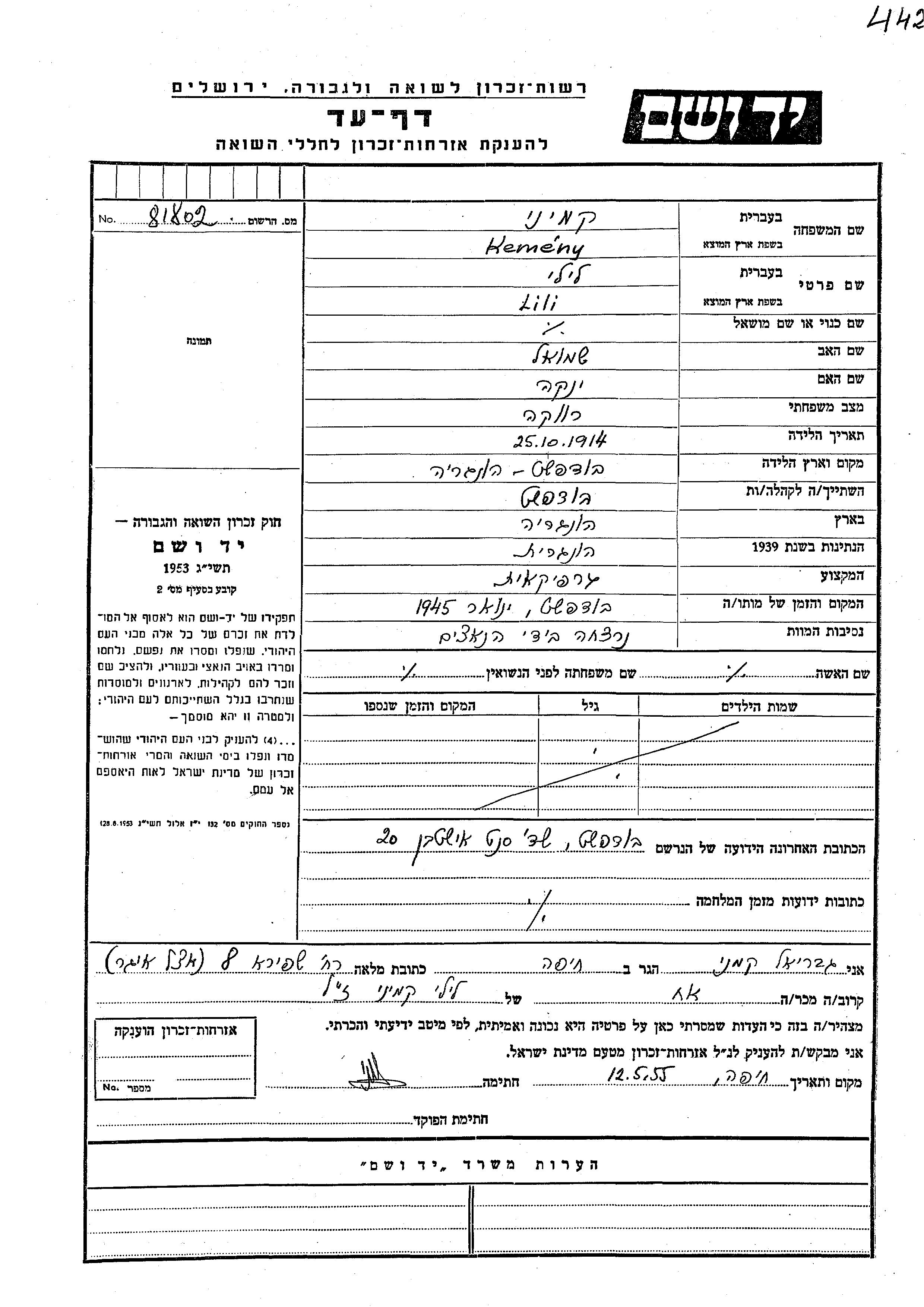 לילי Kemeny נולדה בBudapest שבהונגריה בשנת 1914 לשמואל וינקה. היא היתה גרפיקאית ורווקה. לפני מלחמת העולם השניה התגוררה בBudapest שבהונגריה. בזמן המלחמה היא היתה בBudapest שבהונגריה. לילי נרצחה בשואה. מקום המוות: Budapest שבהונגריה בשנת 1945.