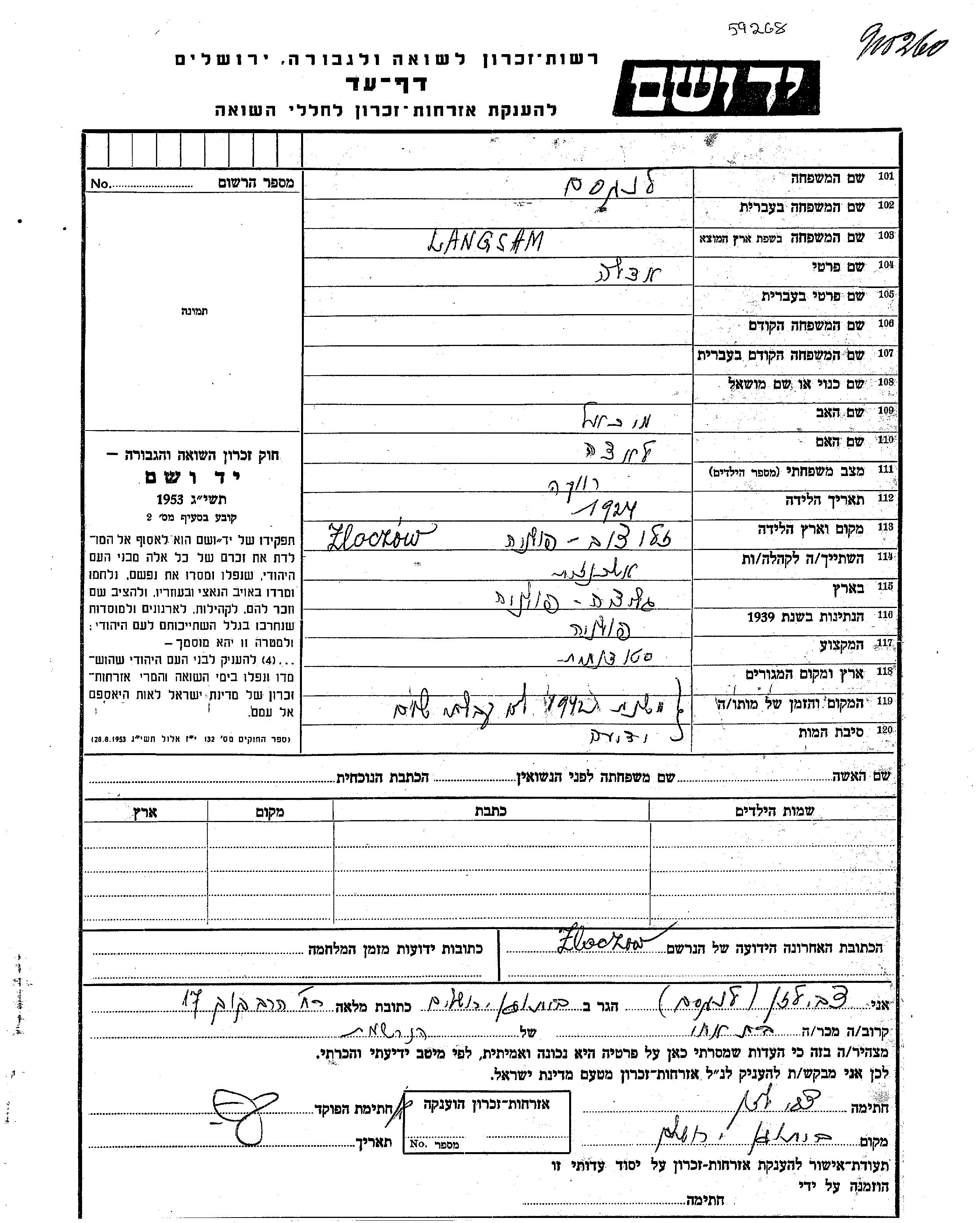 אדלה לנגסם נולדה בZloczow שבפולין בשנת 1924 למיכאל ולאצה. היא היתה סטודנטית. לפני מלחמת העולם השניה התגוררה בZloczow שבפולין. בזמן המלחמה היא היתה בZloczow שבפולין. אדלה נרצחה בשואה.