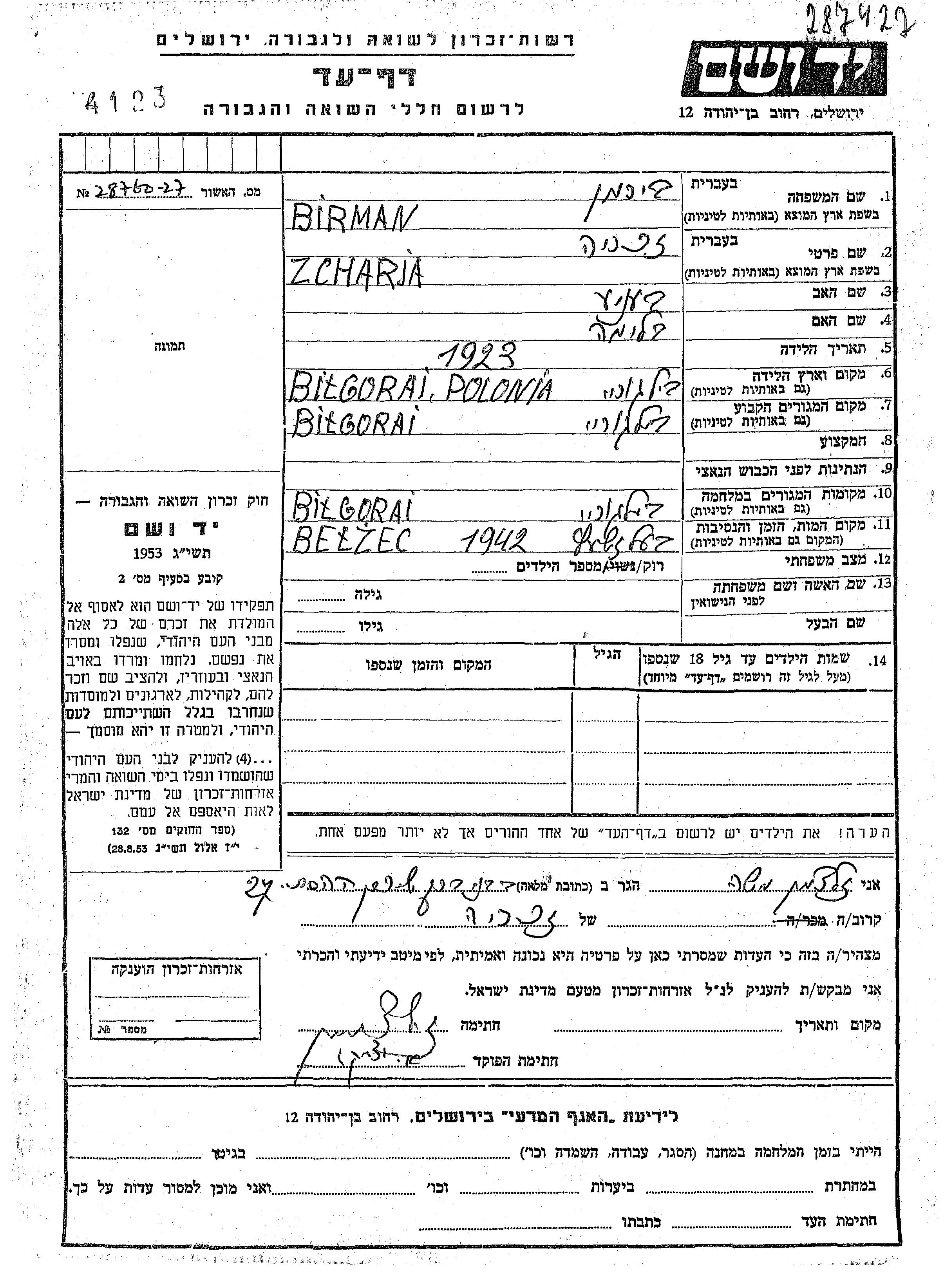 בירמן Zcharja 1923 Bilgoraj, פולין דף-עד