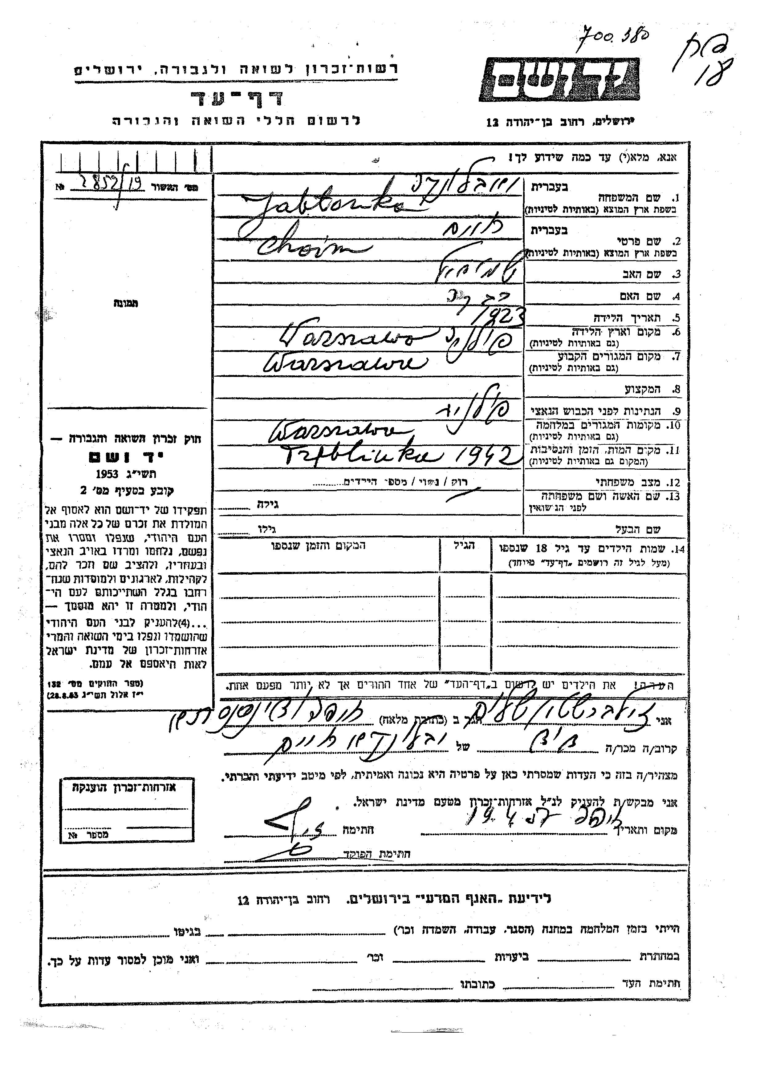 Jablonka חיים 1923 Warszawa, פולין דף-עד