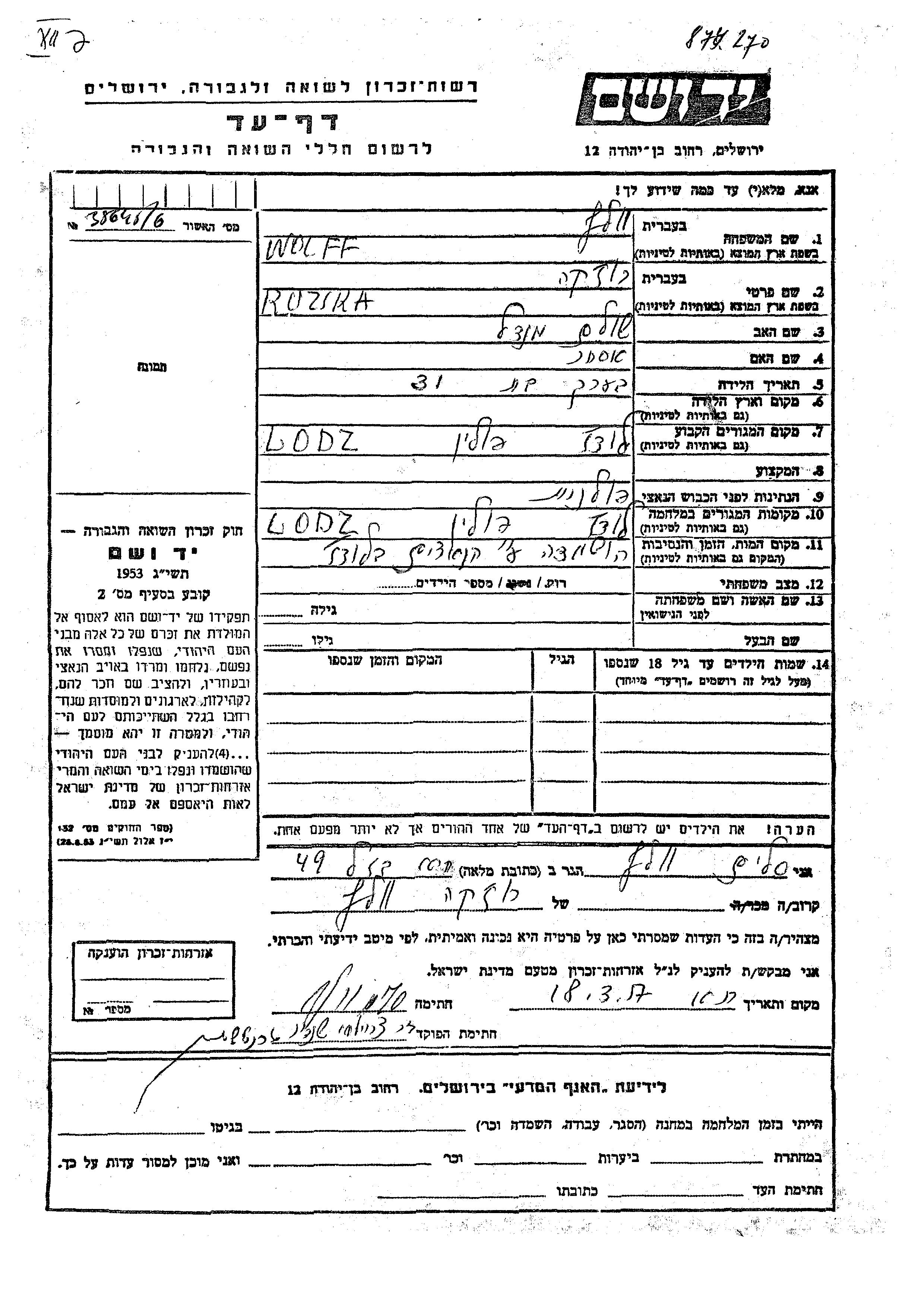 Rozska Wolff נולדה לשולם מנדל ואסתר. היא היתה רווקה. לפני מלחמת העולם השניה התגוררה בLodz שבפולין. בזמן המלחמה היא היתה בLodz שבפולין. היא נרצחה בשואה.