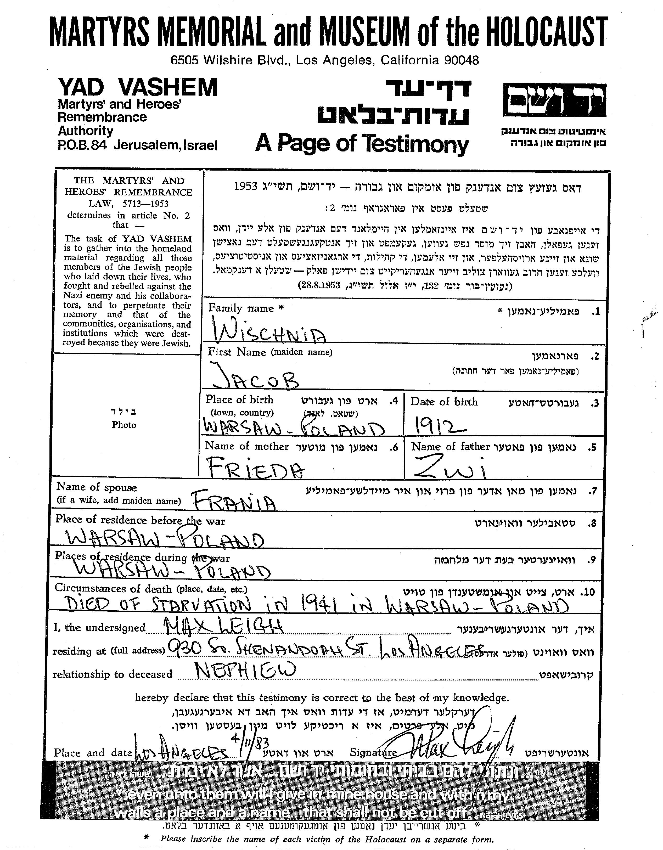 Jacob Wischnia נולד בWarszawa שבפולין בשנת 1912 לZwi וFrieda. הוא היה נשוי לFrania. לפני מלחמת העולם השניה התגורר בWarszawa שבפולין. בזמן המלחמה הוא היה בWarszawa שבפולין.