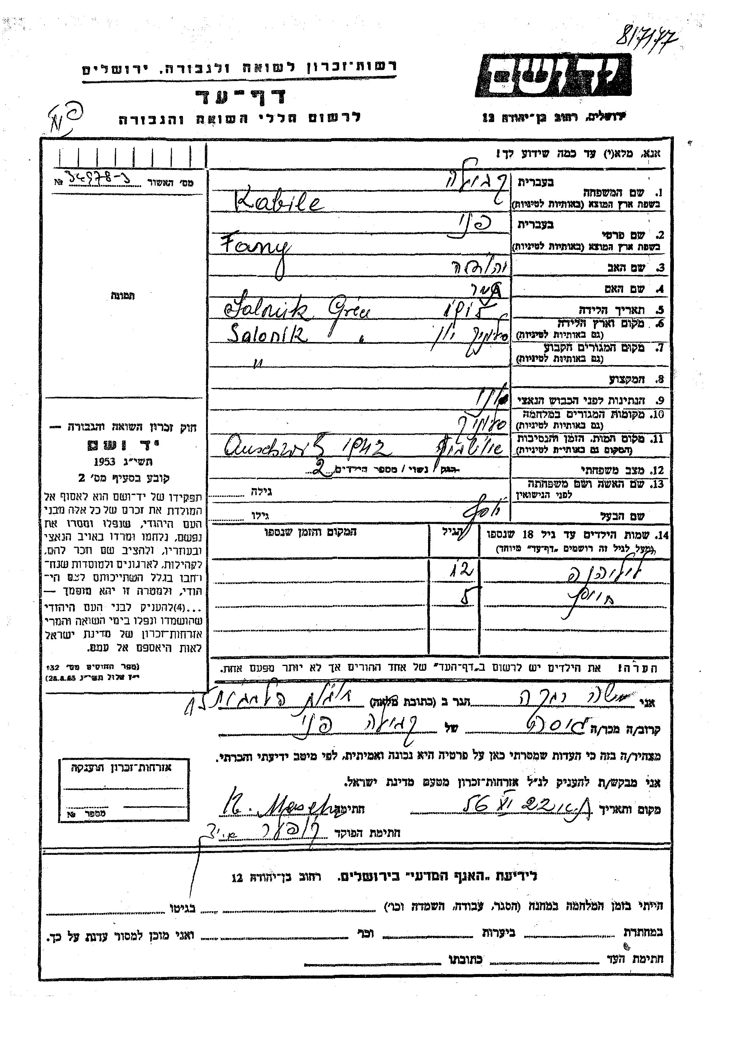Kabile Fany פני 1915 Salonika, יון דף-עד