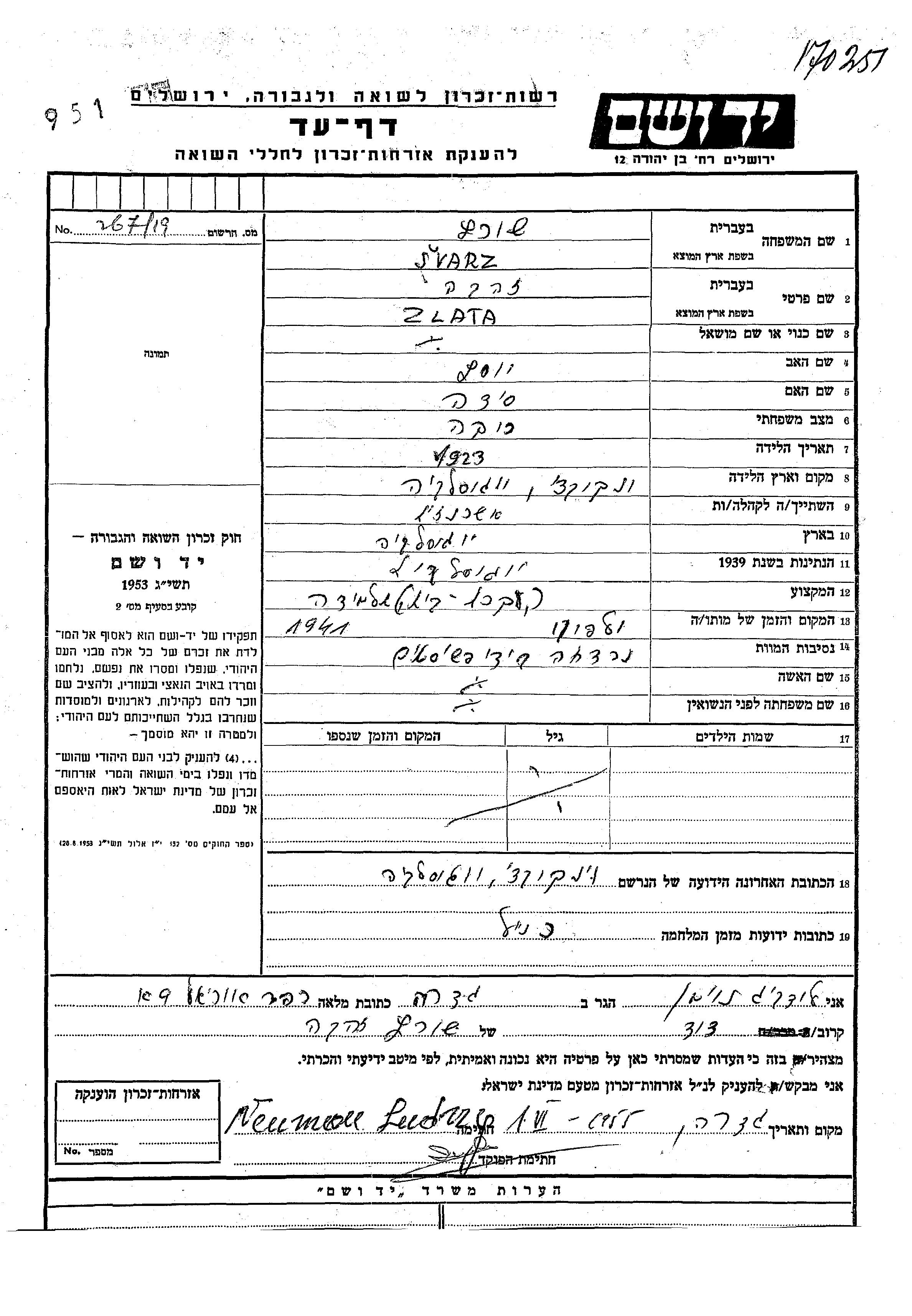 זלטה זהבה Svarz נולדה בVinkovci שביוגוסלביה בשנת 1923 ליוסף וריקה. היא היתה עקרת בית ורווקה. לפני מלחמת העולם השניה התגוררה בVinkovci שביוגוסלביה. בזמן המלחמה היא היתה בVinkovci שביוגוסלביה. זלטה זהבה נרצחה בשואה. מקום המוות: Valpovo שביוגוסלביה בשנת 1941.