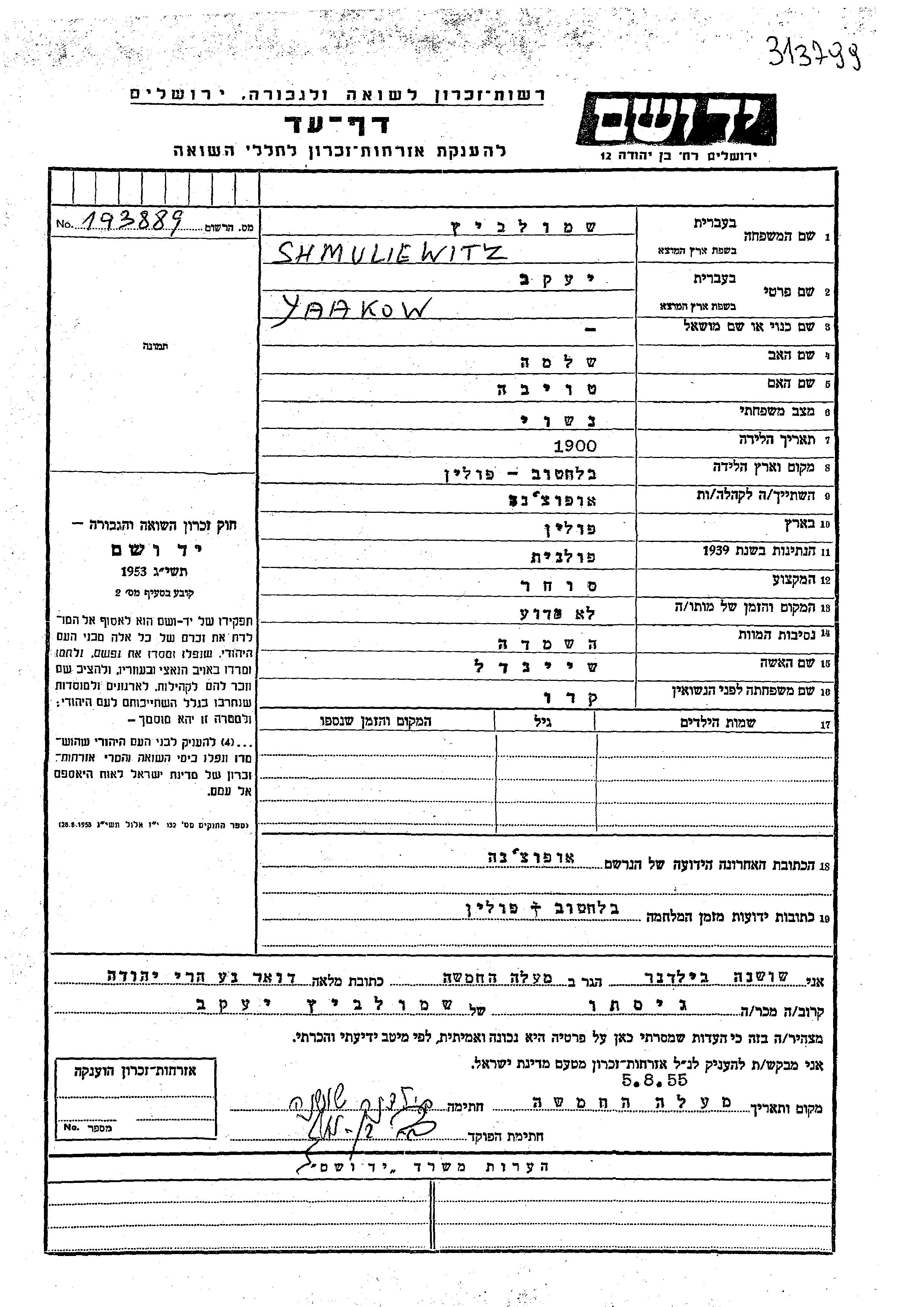 Yaakow Shmuliewitz נולד בBełchatów שבפולין בשנת 1900 לשלמה וטויבה. הוא היה סוחר ונשוי לשיינדל לבית קרו. לפני מלחמת העולם השניה התגורר בOpoczno שבפולין. בזמן המלחמה הוא היה בBełchatów שבפולין. הוא נרצח בשואה.