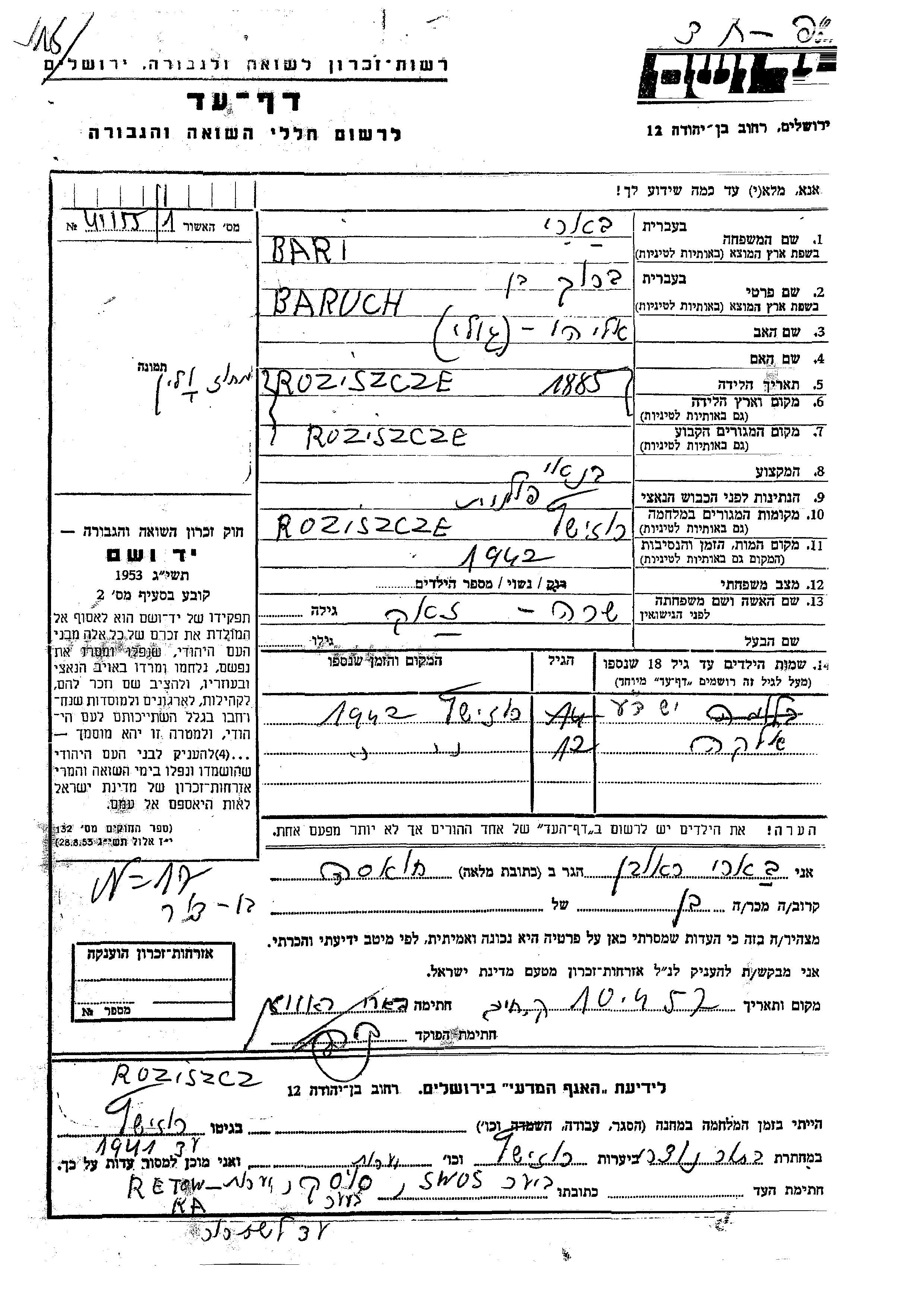 בארי ברוך בן 1885 Rozhishche, פולין דף-עד