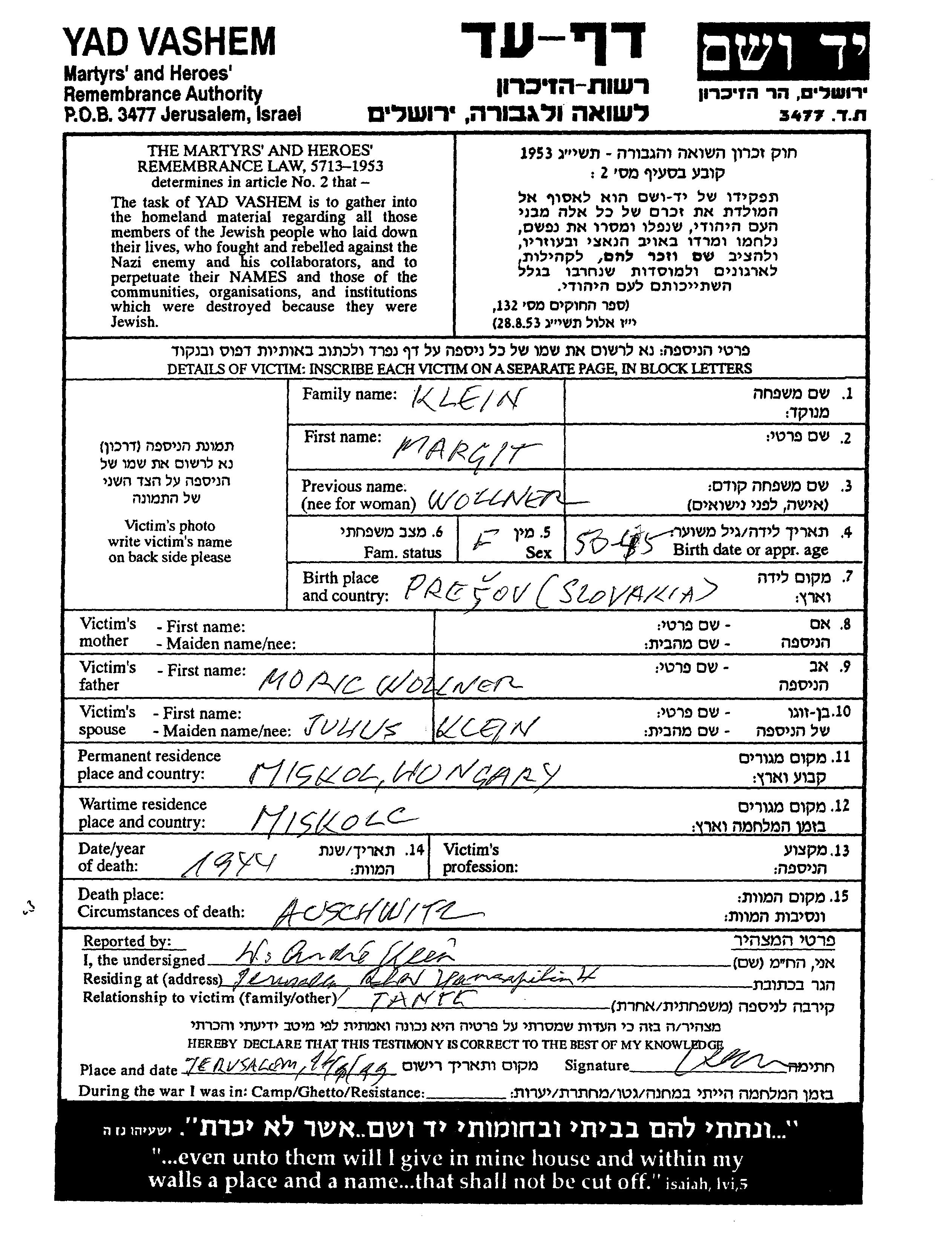 Margit קליין לבית Wollner נולדה בPresov שבצ'כוסלובקיה לMoric. היא היתה נשואה לJulius. לפני מלחמת העולם השניה התגוררה בMiskolc שבהונגריה. בזמן המלחמה היא היתה בMiskolc שבהונגריה. היא נרצחה בשואה. מקום המוות: Auschwitz שבפולין בשנת 1944.