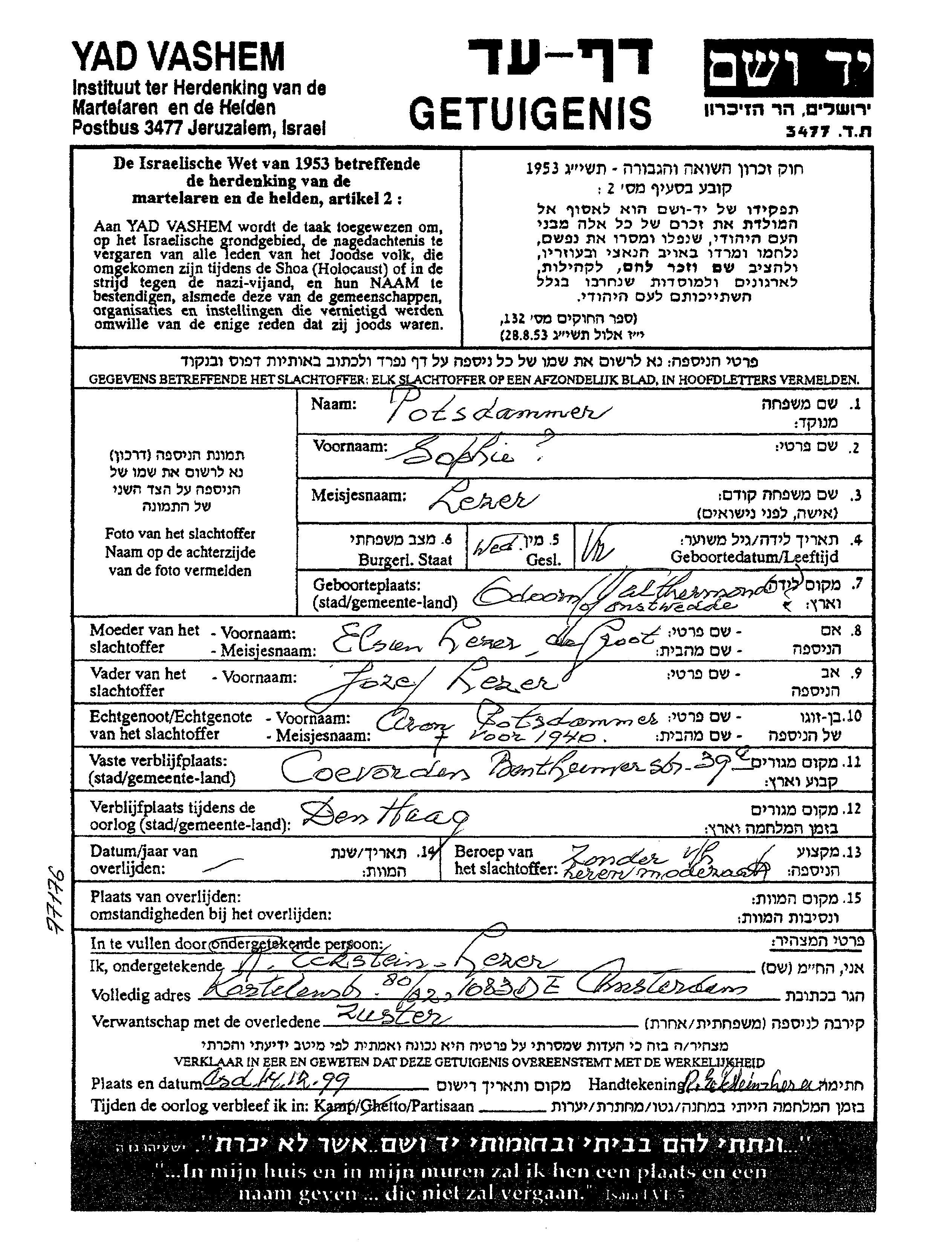 Sophie Potsdammer לבית לזר נולדה בCoevorden שבהולנד לJozef וElsien. היא היתה ללא מקצוע. לפני מלחמת העולם השניה התגוררה בCoevorden שבהולנד. בזמן המלחמה היא היתה בDen Haag שבהולנד.