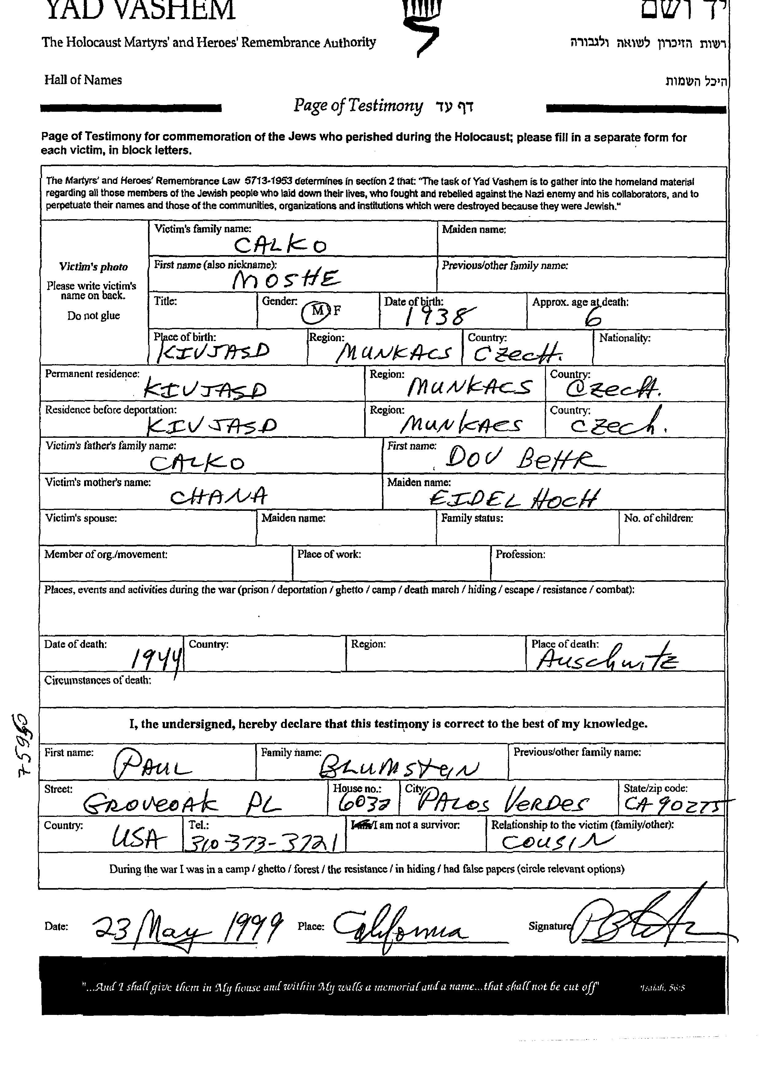 משה Calko נולד בKivjazd שבצ'כוסלובקיה בשנת 1938 לדוב Behr וחנה. לפני מלחמת העולם השניה התגורר בKivjazd שבצ'כוסלובקיה. בזמן המלחמה הוא היה בKivjazd שבצ'כוסלובקיה.