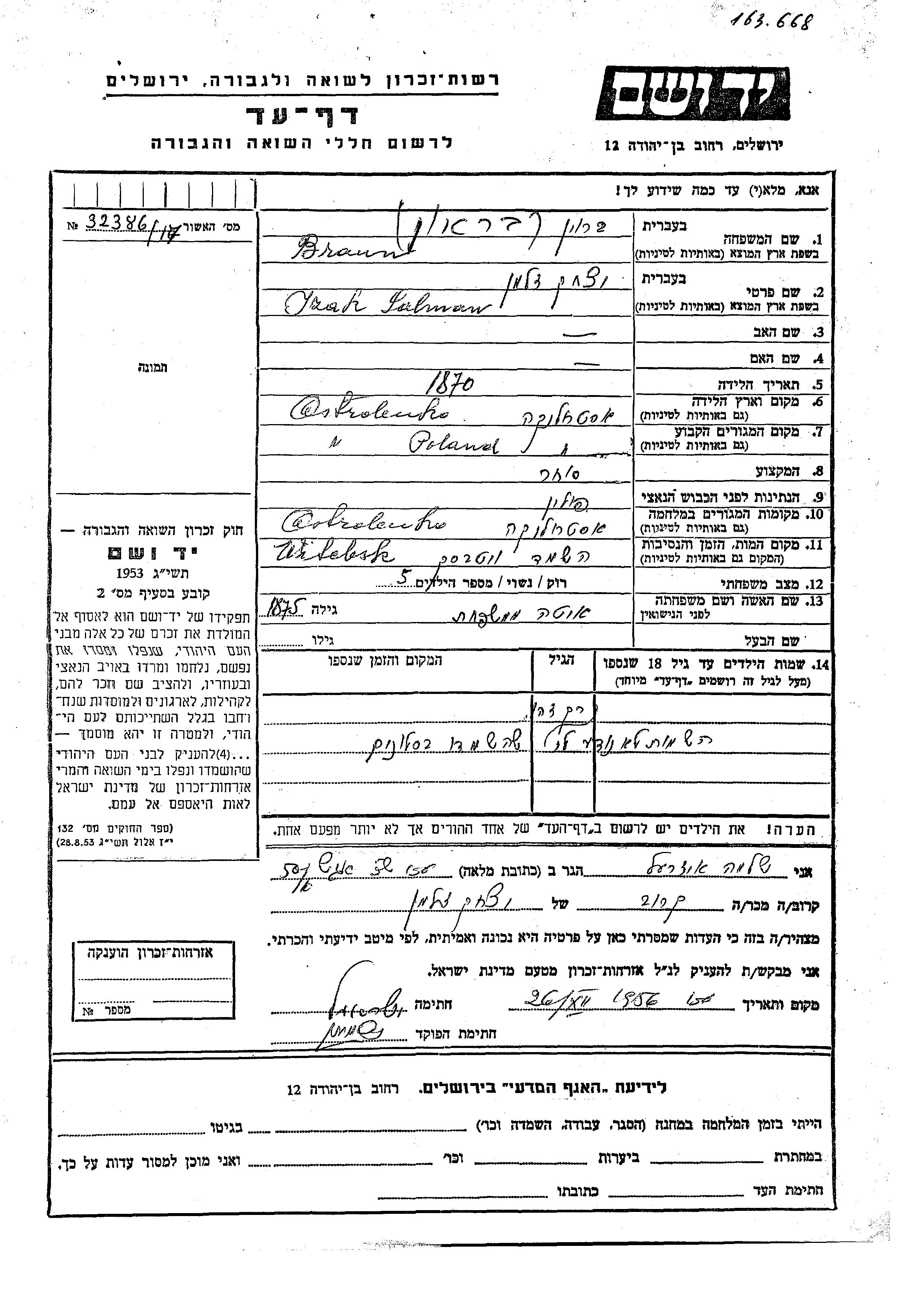 איזק סלמן נרצח בשואה. מקום המוות: Witebsk שבביאלורוסיה (ברה"מ).