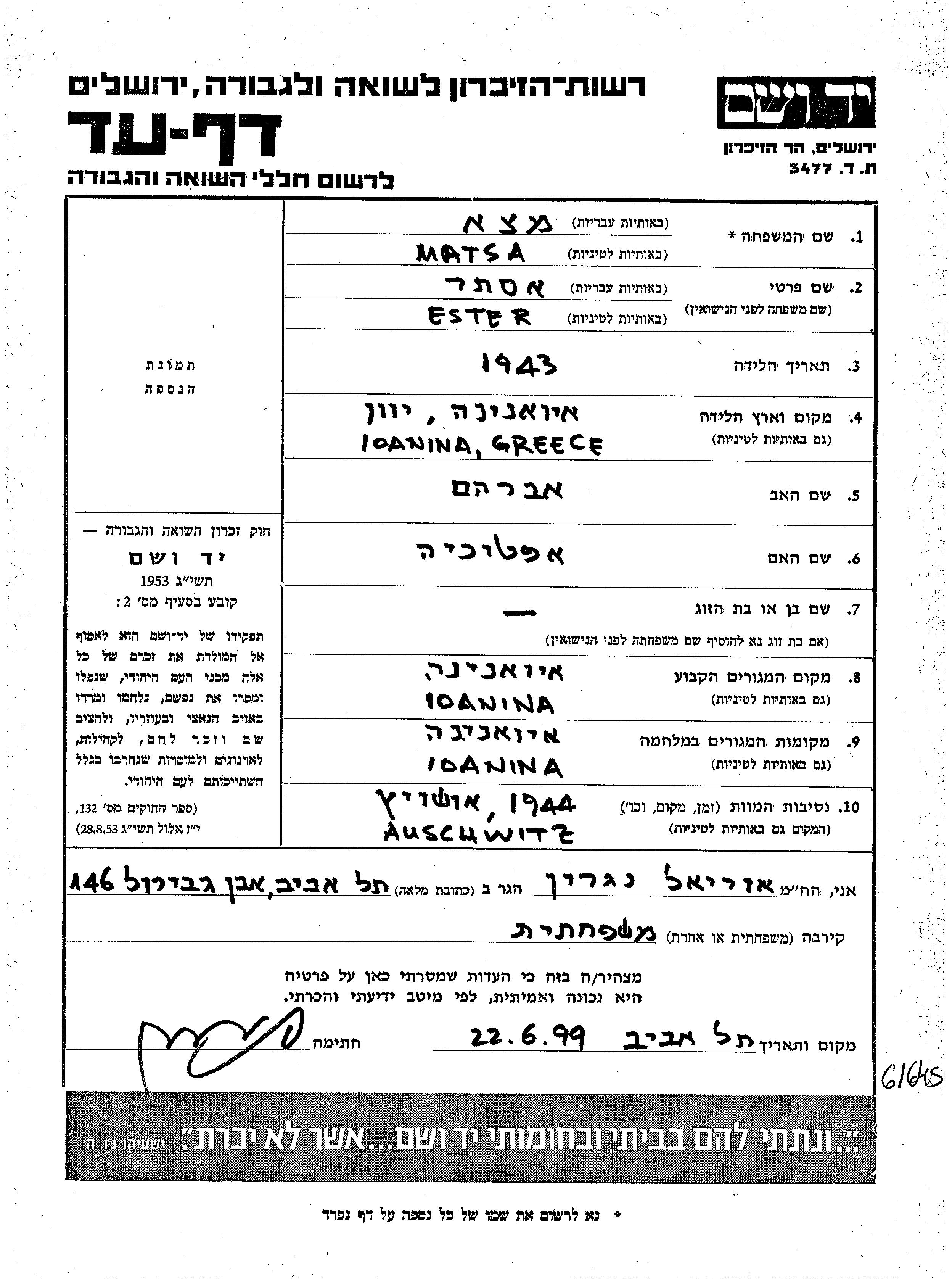 Matsa אסתר 1943 Ioannina, יון דף-עד