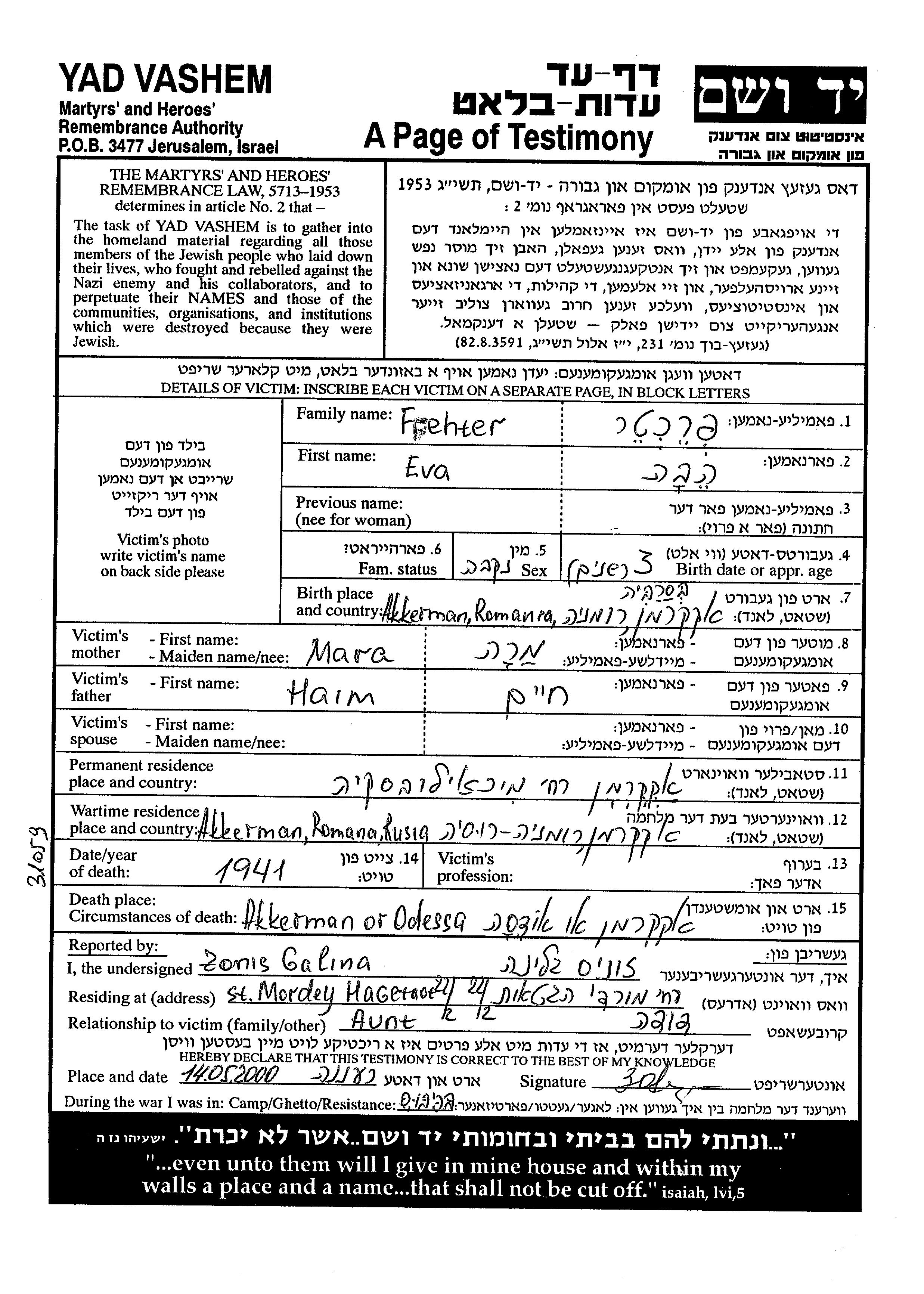 הבה אווה Frehter נולדה בAkkerman שברומניה לHaim וMara מרה. לפני מלחמת העולם השניה התגוררה בAkkerman שברומניה. בזמן המלחמה היא היתה בAkkerman שברומניה.