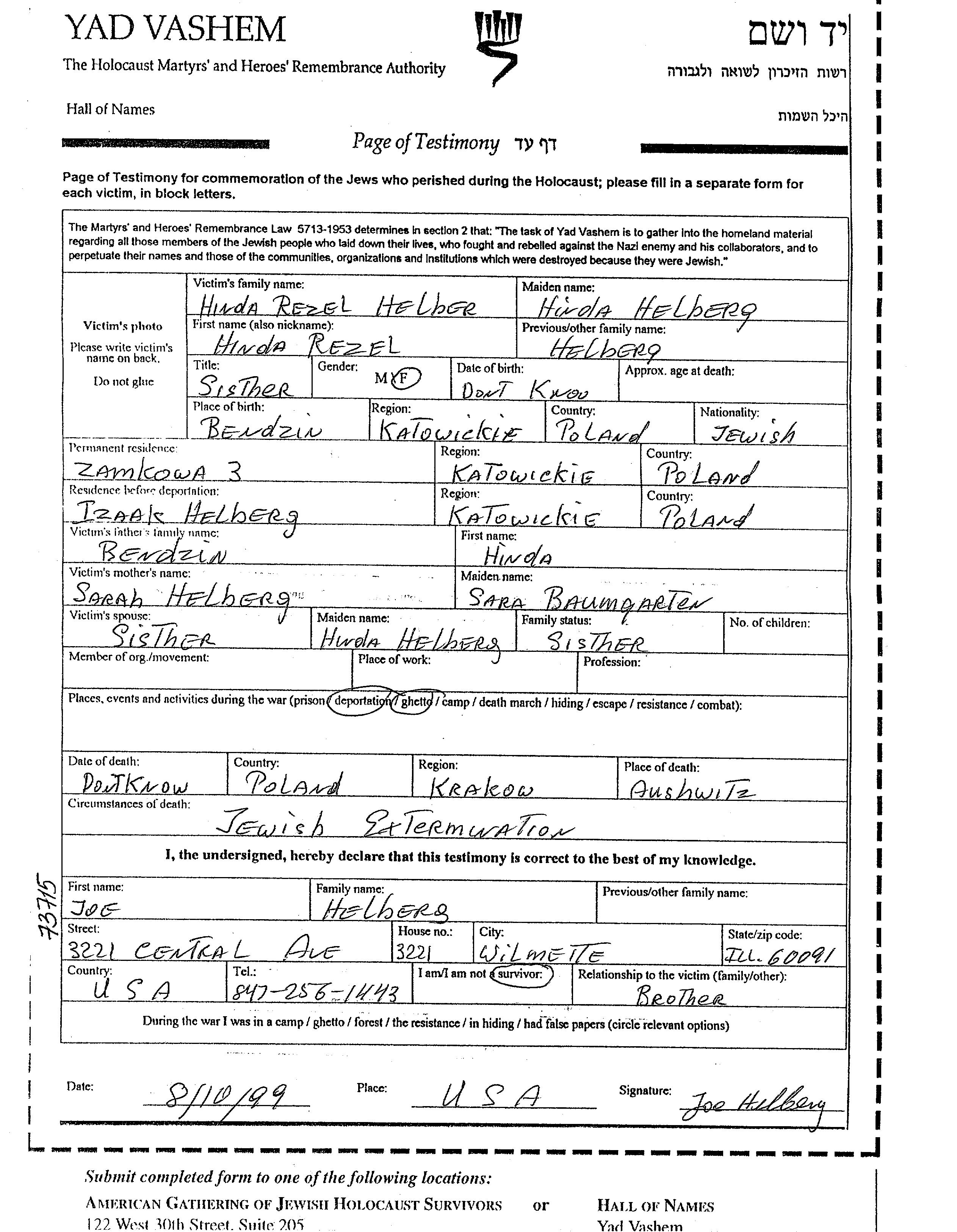 הינדה Rezel נרצחה בשואה. מקום המוות: Auschwitz שבפולין.