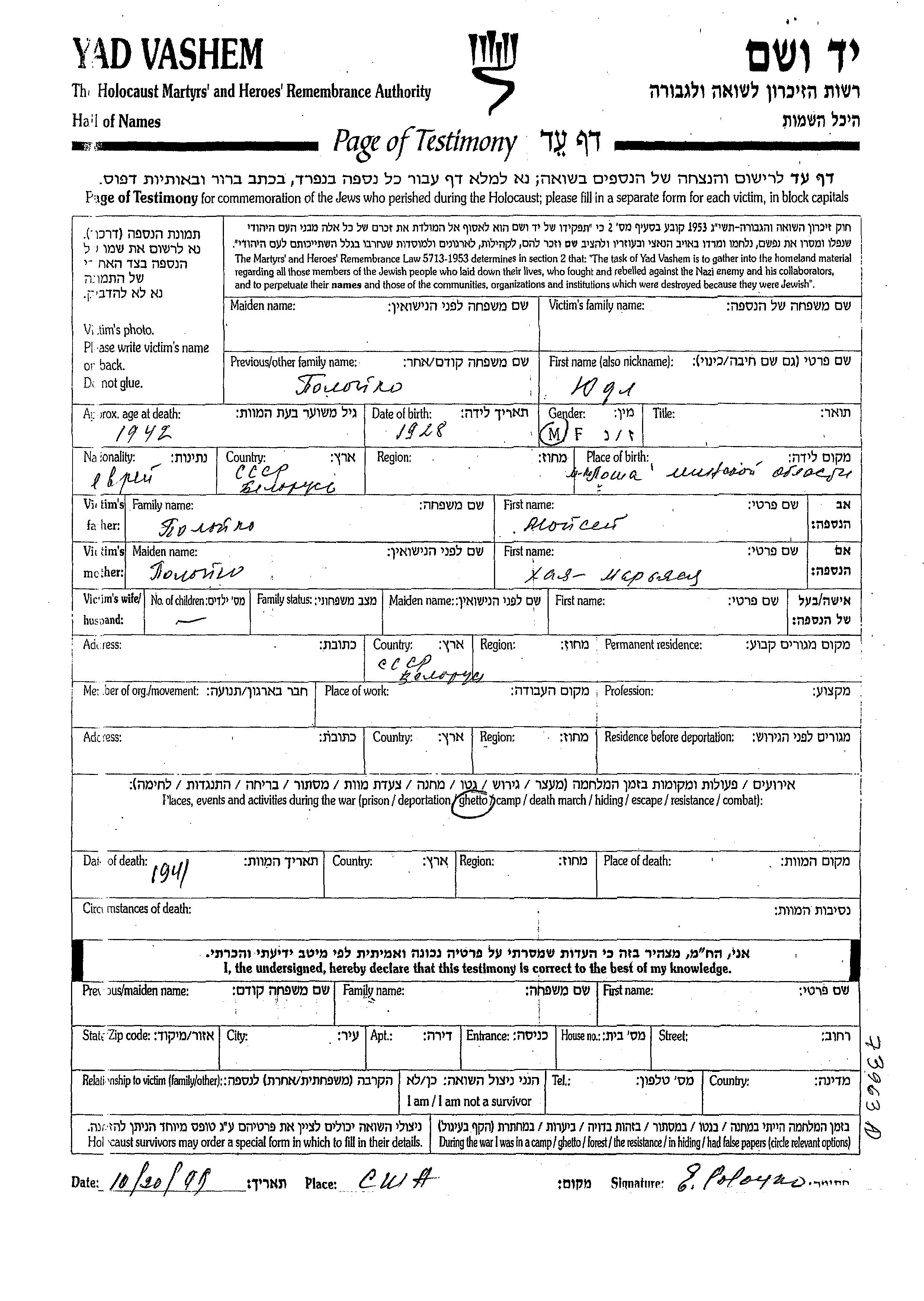 Yudl פולויקו נולד בLosha שבביאלורוסיה (ברה"מ) בשנת 1928 למואיסאי וחייה Maryasya. הוא היה נער. לפני מלחמת העולם השניה התגורר בביאלורוסיה (ברה"מ). בזמן המלחמה הוא היה בביאלורוסיה (ברה"מ). הוא נרצח בשואה. מקום המוות: ביאלורוסיה (ברה"מ) בשנת 1941.