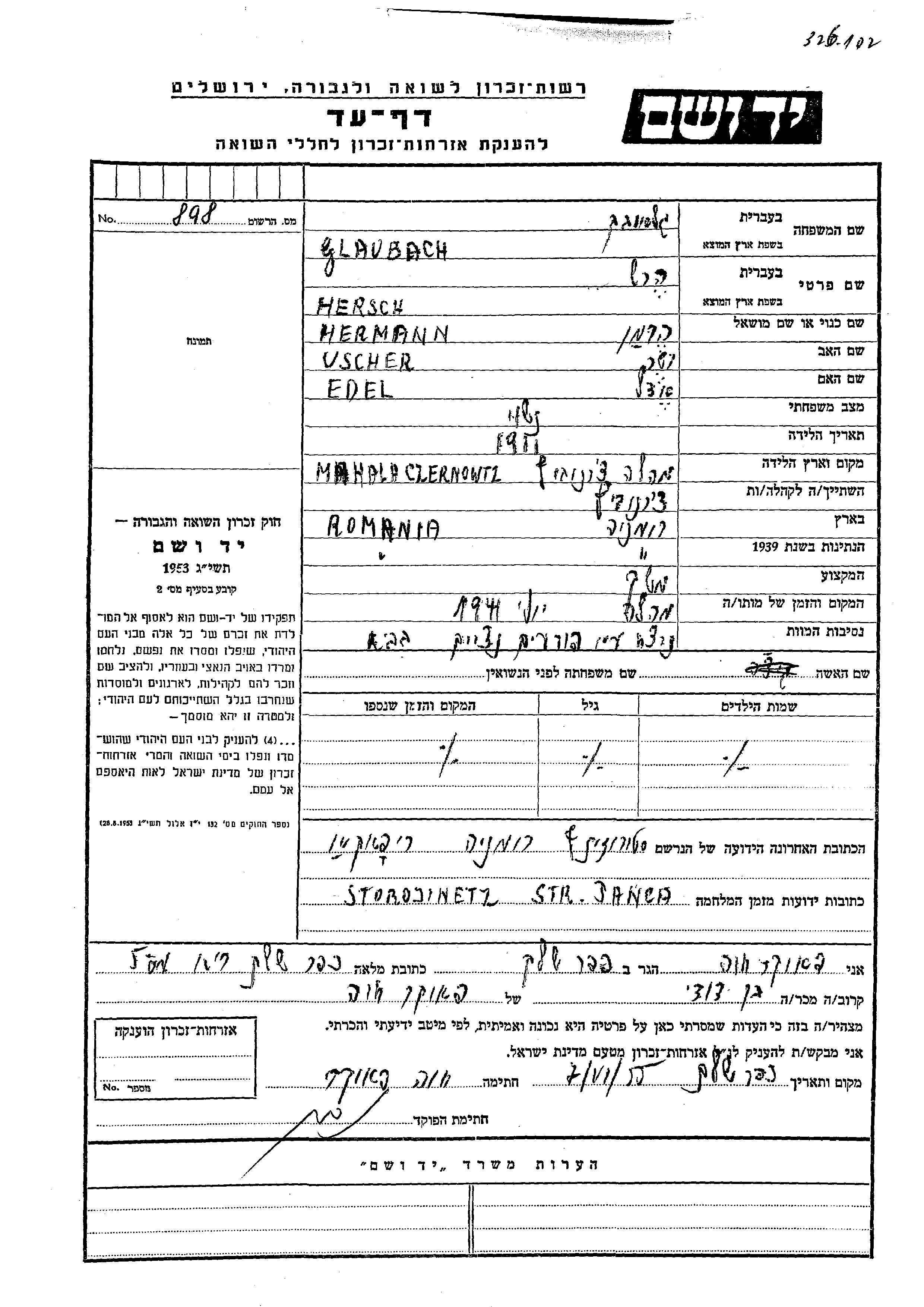 Glaubach Hersch 1911 Czernowitz, רומניה דף-עד
