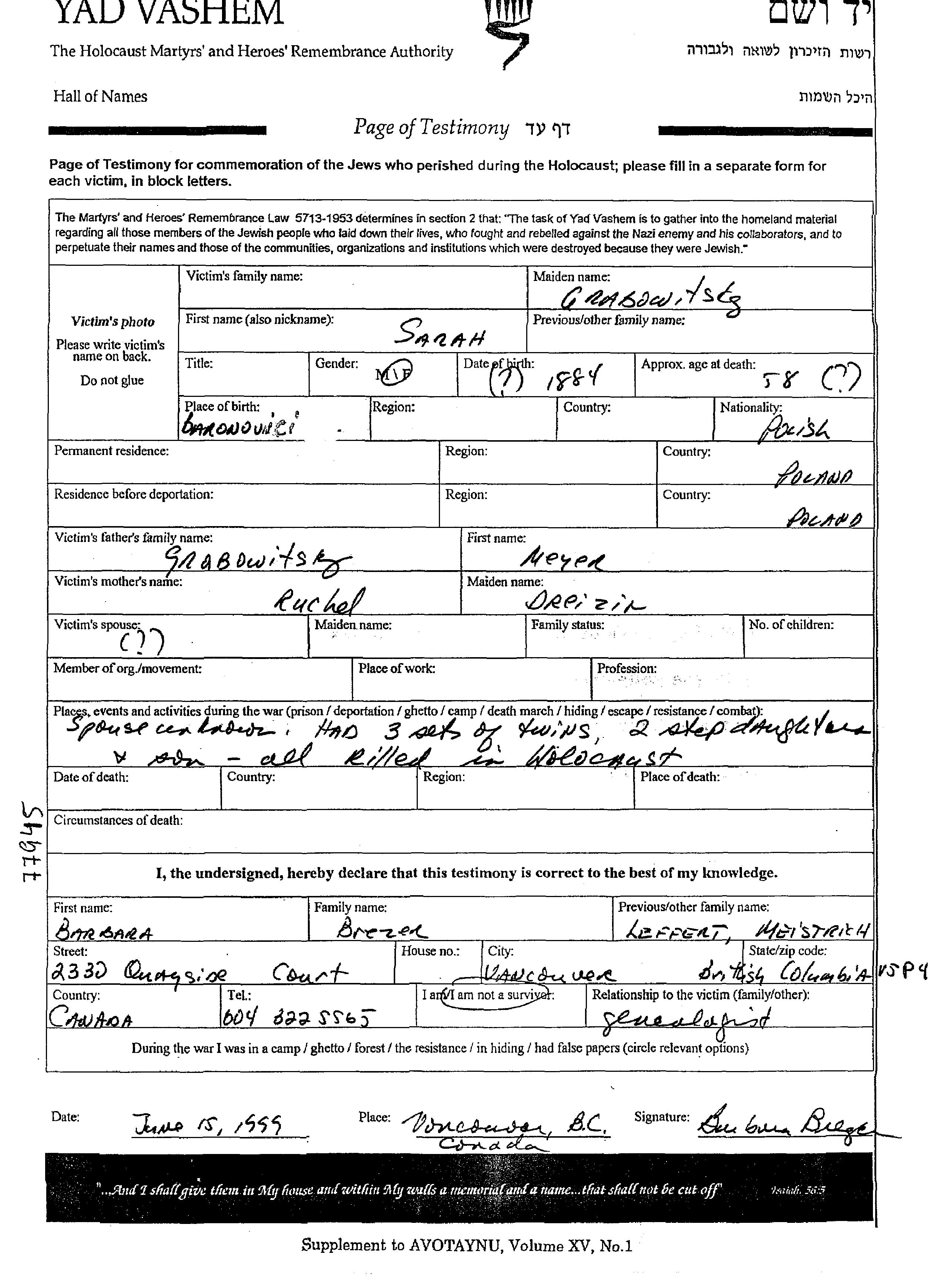 Sarah שם משפחה לא ידוע לבית Grabowitsky נולדה בBaranowicz שבפולין בשנת 1884 לMeyer וRuchel. היא היתה נשואה. לפני מלחמת העולם השניה התגוררה בפולין. בזמן המלחמה היא היתה בפולין. היא נרצחה בשואה.