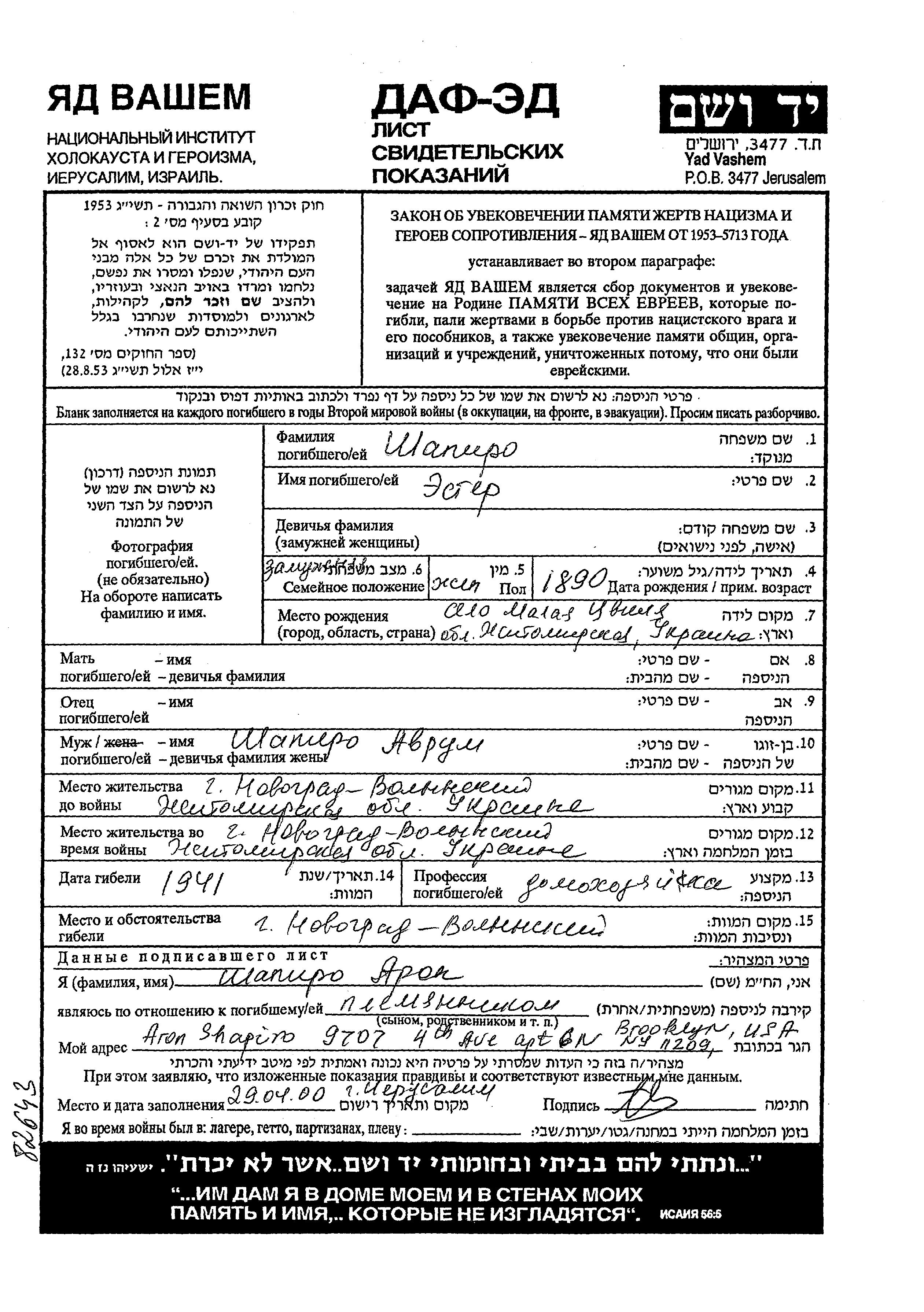 אסתר שפירה נולדה בMalaya Tsvilya שבאוקראינה (ברה"מ) בשנת 1890. היא היתה עקרת בית ונשואה לAvrum. לפני מלחמת העולם השניה התגוררה בNovograd Volynskij שבאוקראינה (ברה"מ). בזמן המלחמה היא היתה בNovograd Volynskij שבאוקראינה (ברה"מ). אסתר נרצחה בשואה. מקום המוות: Novograd Volynskij שבאוקראינה (ברה"מ) בשנת 1941.