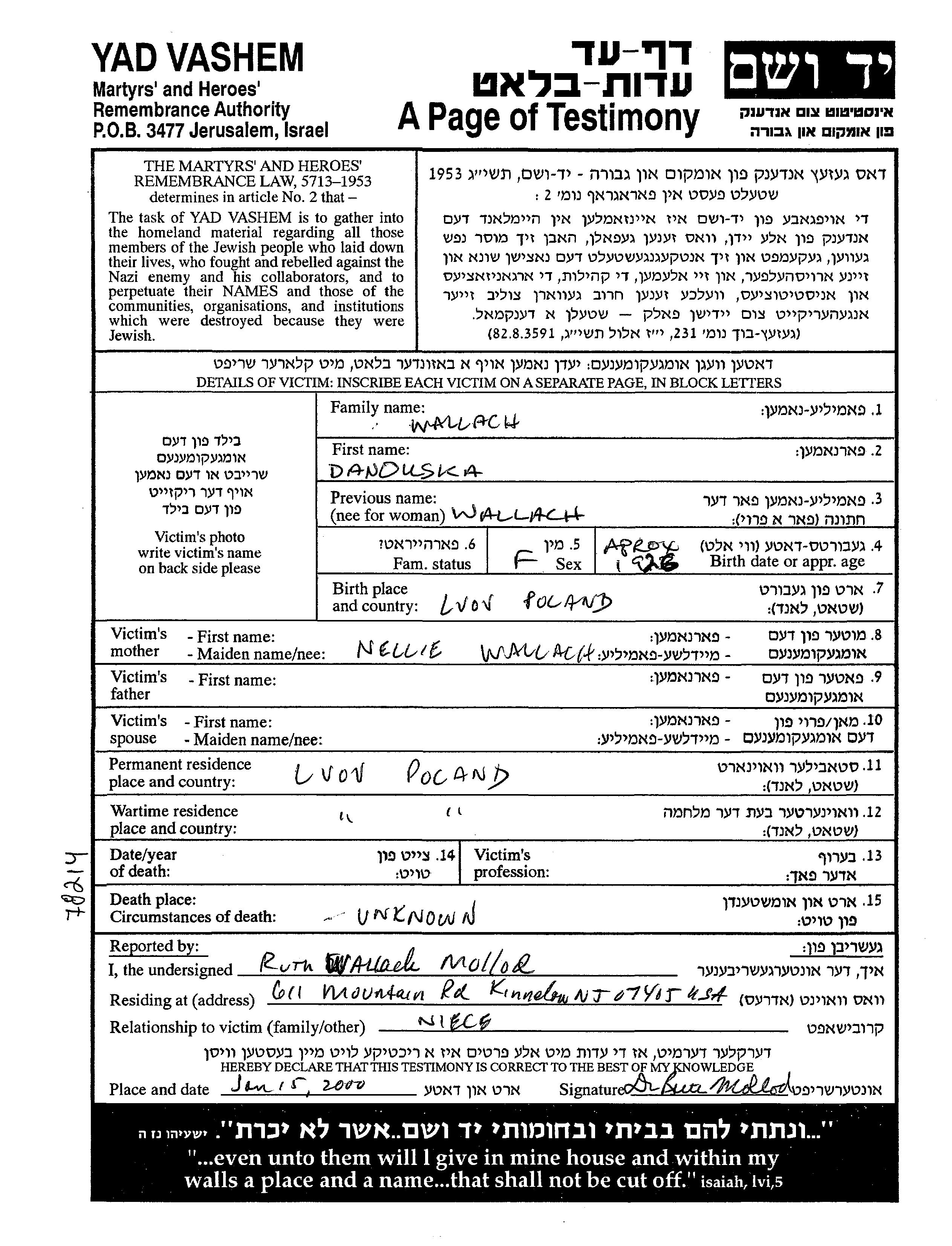 דנדושקה Wallach נולד בLvov שבפולין בשנת 1926 לNellie. לפני מלחמת העולם השניה התגורר בLvov שבפולין. בזמן המלחמה הוא היה בLvov שבפולין.