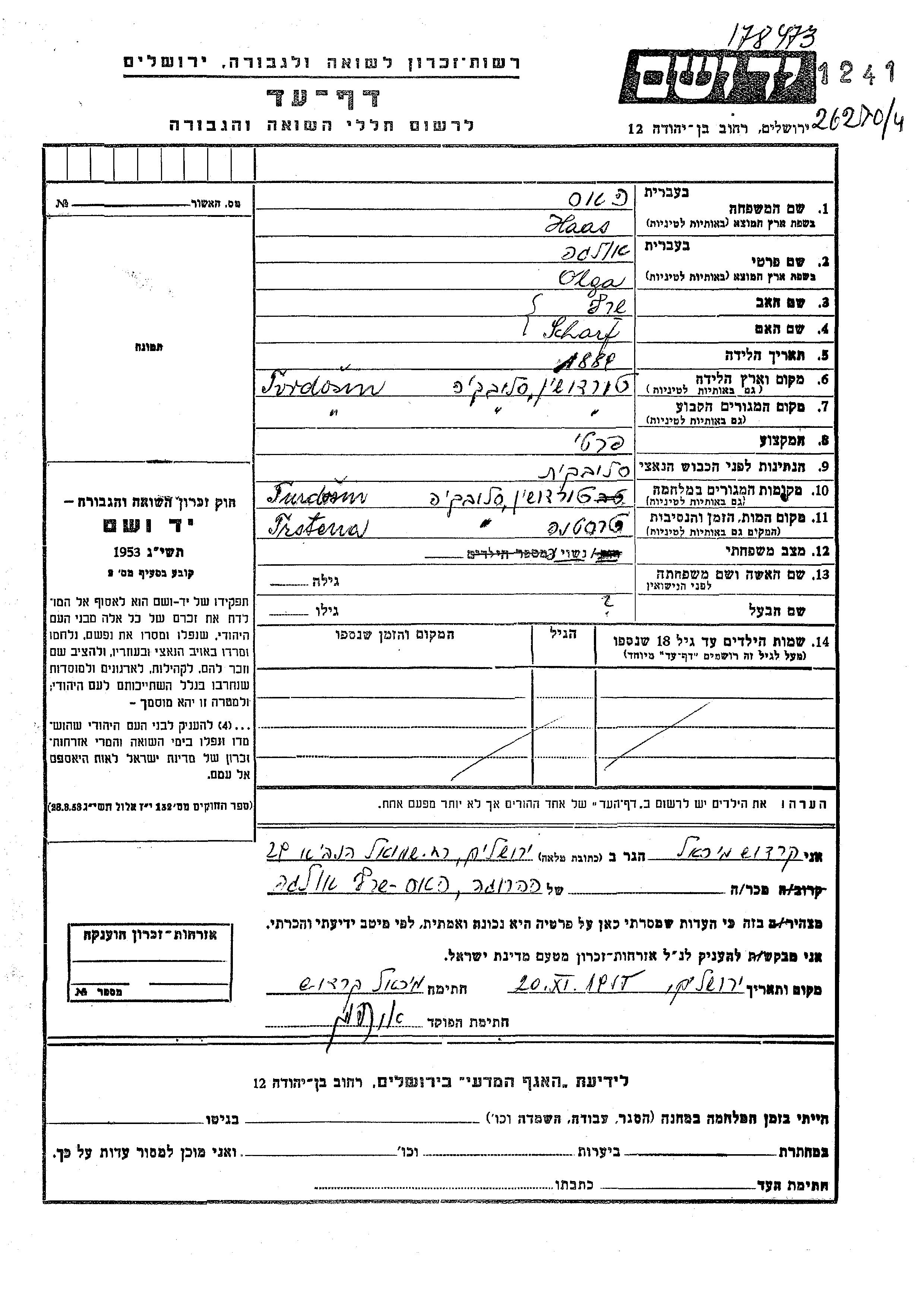 אולגה Hass לבית Scharf נולדה בTurdosin שבצ'כוסלובקיה בשנת 1889. היא היתה עצמאית ונשואה. לפני מלחמת העולם השניה התגוררה בTurdosin שבצ'כוסלובקיה. בזמן המלחמה היא היתה בTurdosin שבצ'כוסלובקיה.
