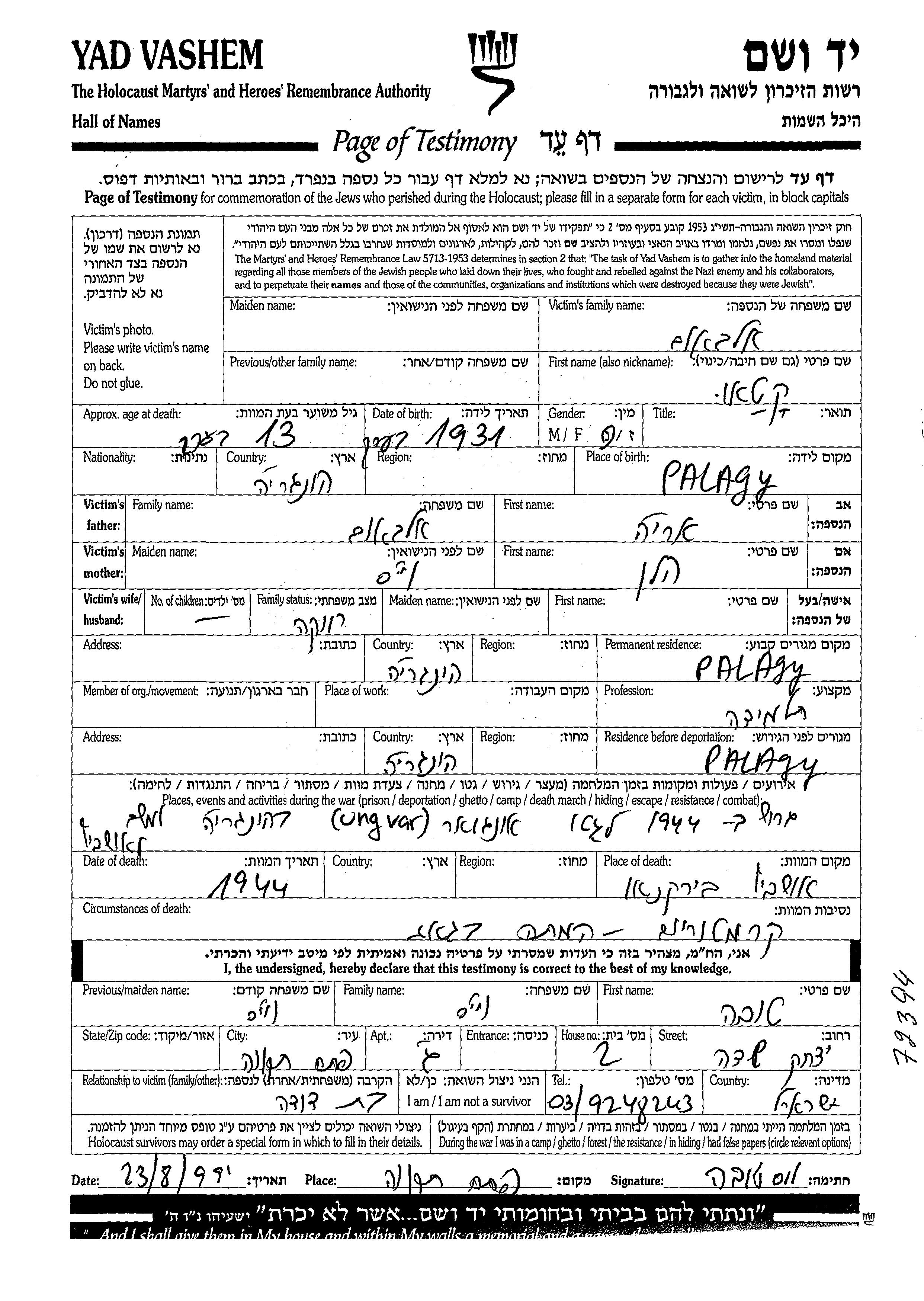קטאו נרצחה בשואה. מקום המוות: Auschwitz שבפולין בשנת 1944.
