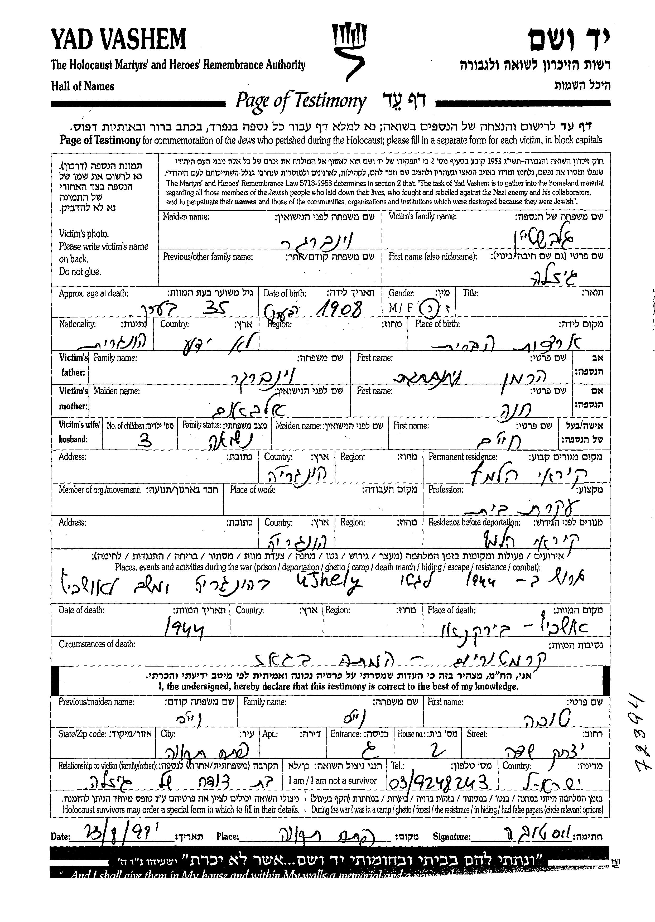 גיזלה נרצחה בשואה. מקום המוות: Birkenau שבפולין בשנת 1944.