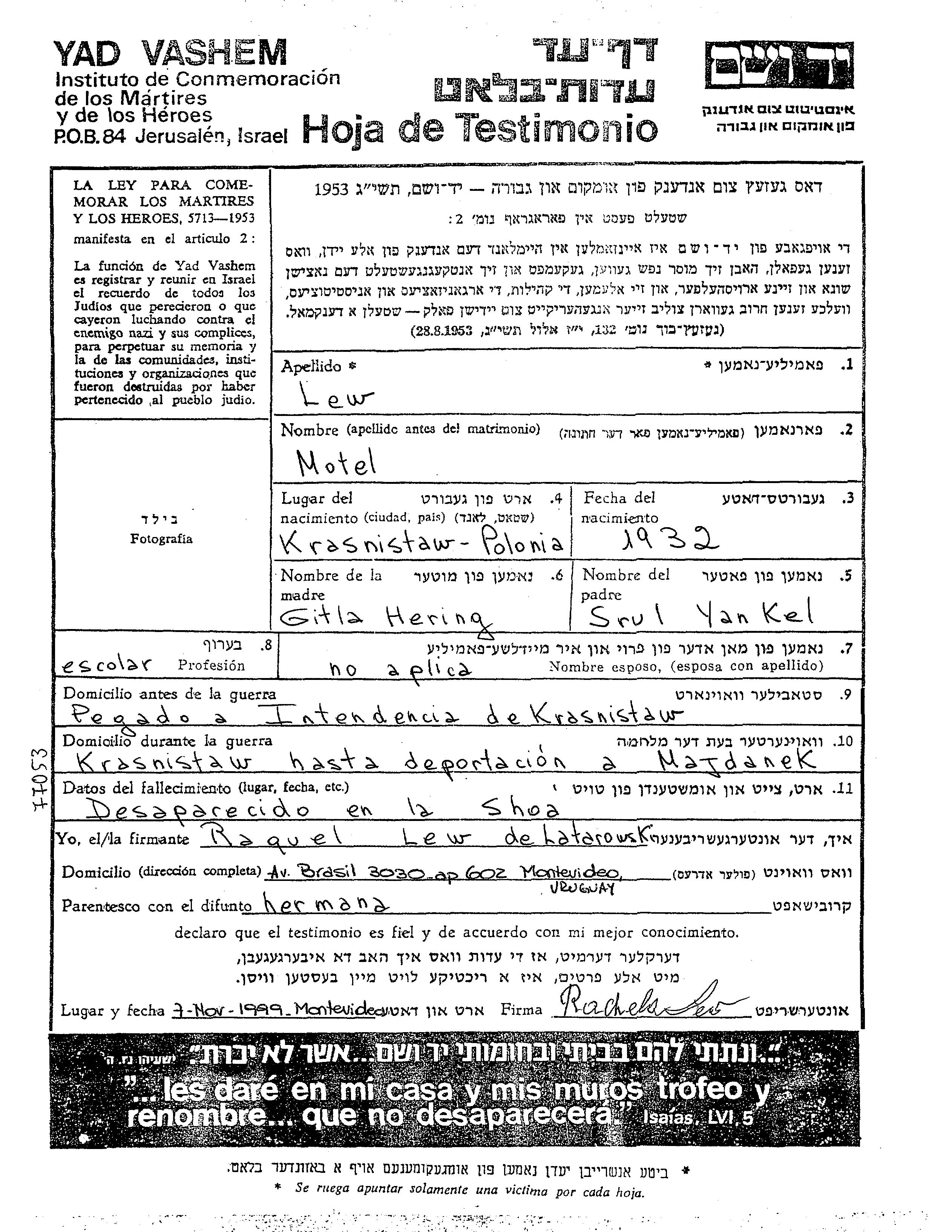 Motel Lew נולד בKrasnistav שבפולין בשנת 1932 לסרול Yankel וGitla. הוא היה סטודנט וילד. לפני מלחמת העולם השניה התגורר בKrasnistav שבפולין. בזמן המלחמה הוא היה בKrasnistav שבפולין.