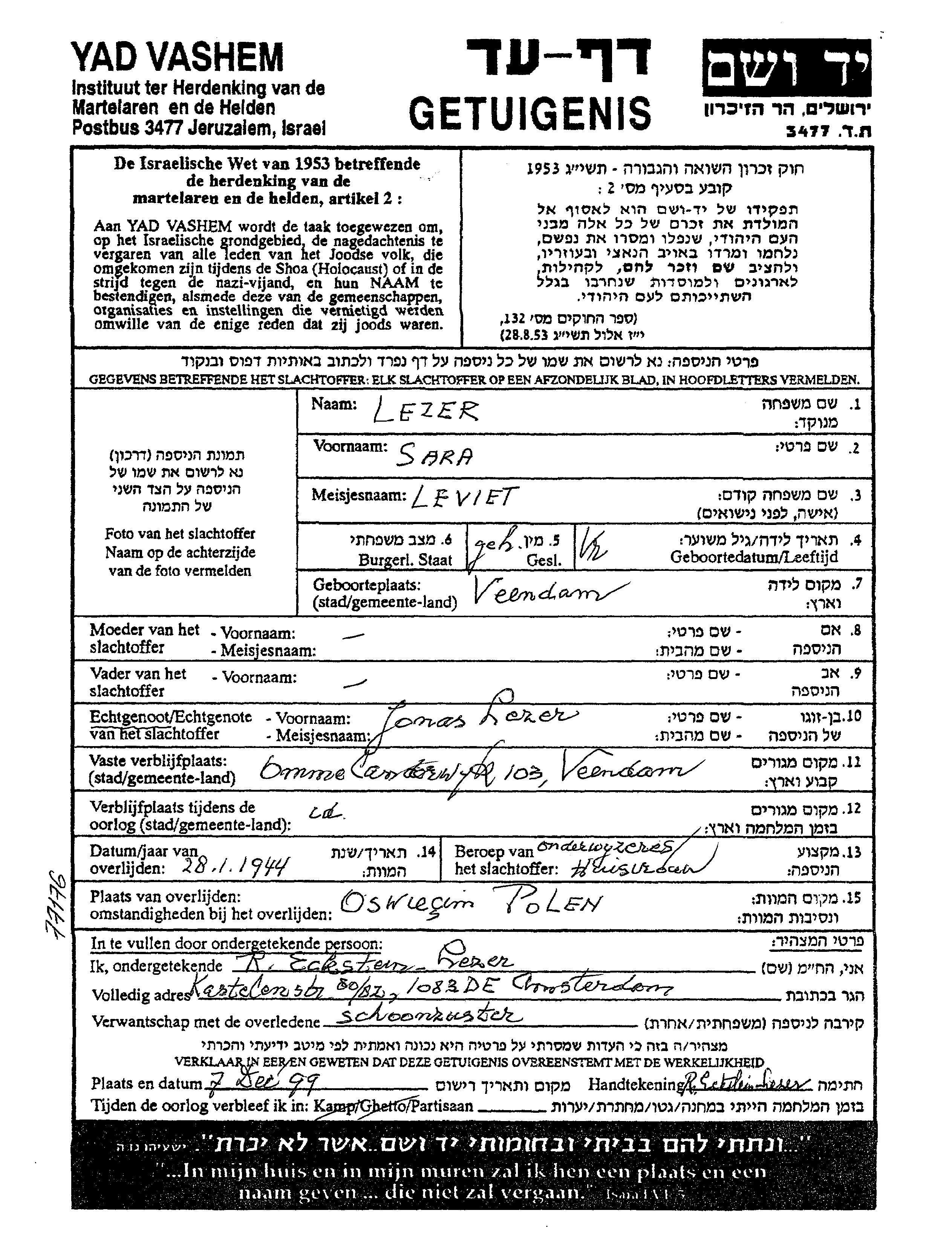 שרה לזר לבית Leviet נולדה בVeendam שבהולנד. היא היתה מורה בבית ספר יסודי ונשואה לJonas. לפני מלחמת העולם השניה התגוררה בVeendam שבהולנד. בזמן המלחמה היא היתה בVeendam שבהולנד.