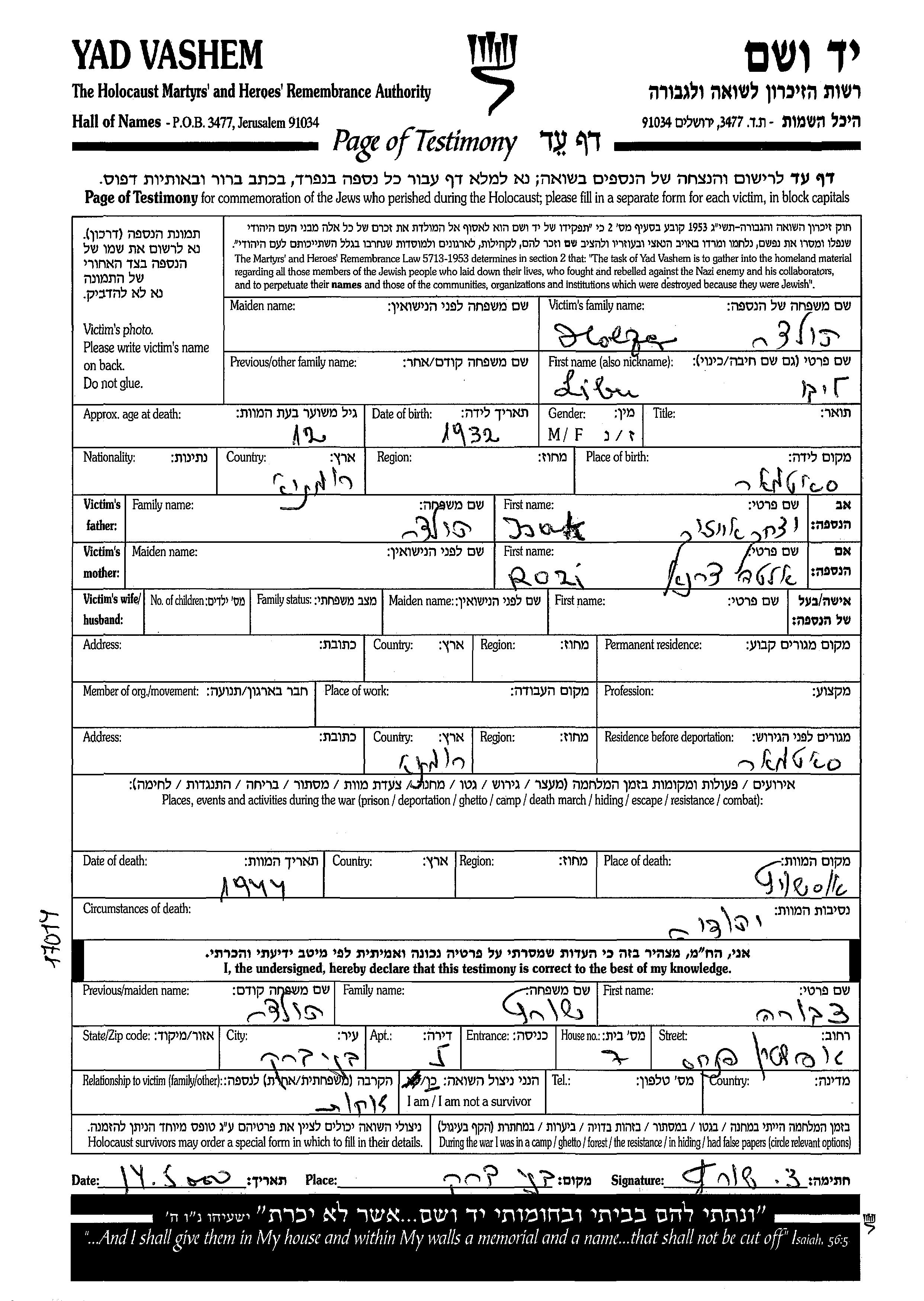 היא/הוא נרצח/ה בשואה. מקום המוות: Auschwitz שבפולין בשנת 1944.