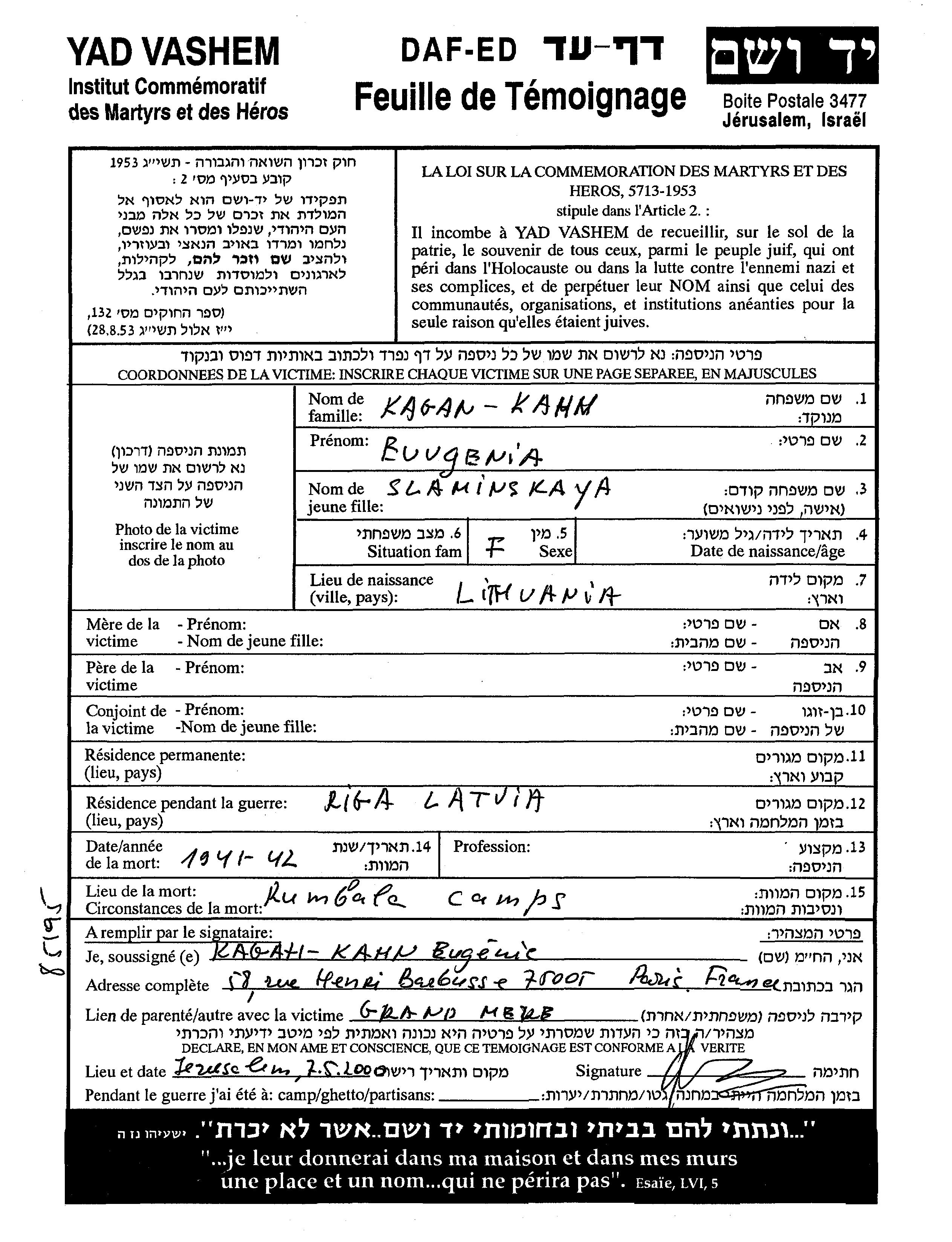 אוגניה כגן לבית Slaminski נולדה בליטא שבליטא. היא היתה נשואה. לפני מלחמת העולם השניה התגוררה במקום לא רשום. בזמן המלחמה היא היתה בRiga שבלטביה.