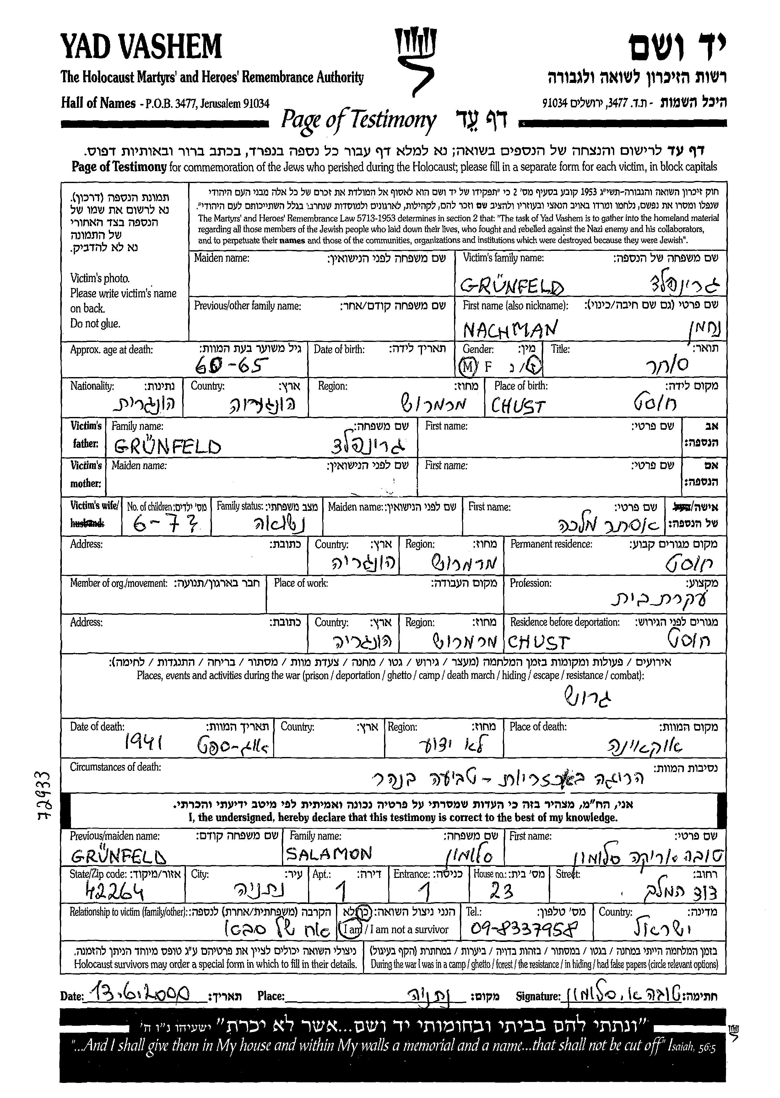 Nachman Gruenfeld נולד בChust שבצ'כוסלובקיה. הוא היה סוחר ונשוי לאסתר מלכה. לפני מלחמת העולם השניה התגורר בChust שבצ'כוסלובקיה. בזמן המלחמה הוא היה בChust שבצ'כוסלובקיה. הוא נרצח בשואה. מקום המוות: אוקראינה (ברה"מ) שבאוקראינה (ברה"מ) בשנת 1941.