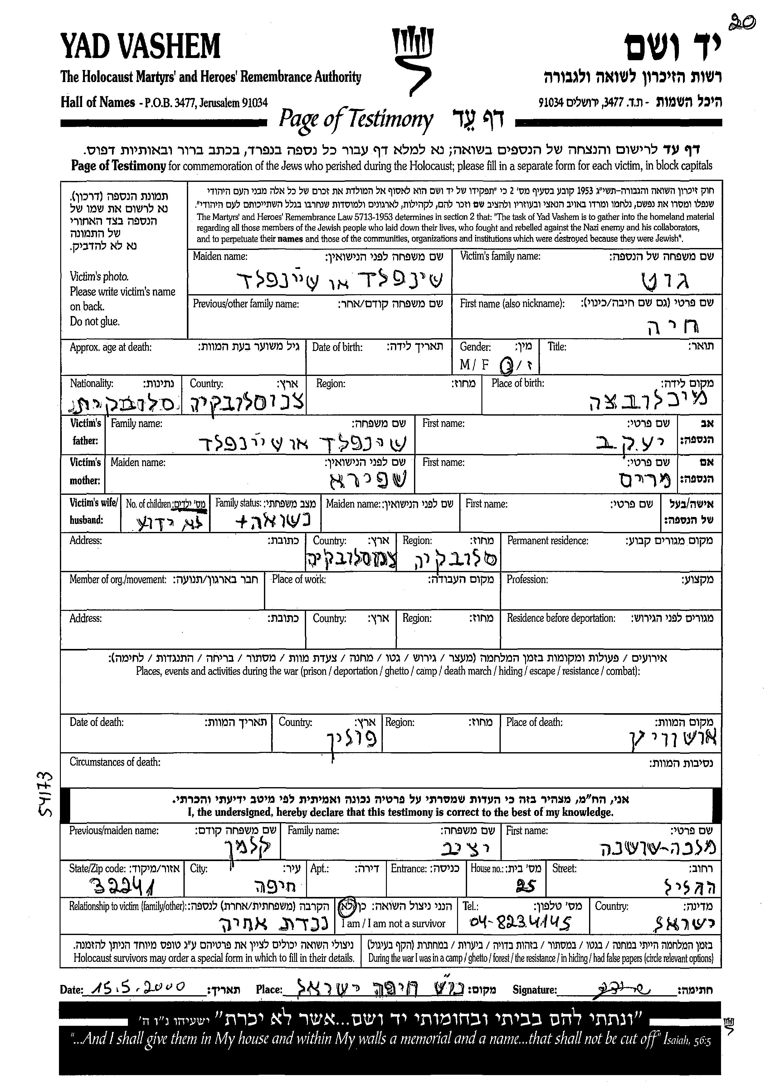גוט שיינפלד חיה צ'כוסלובקיה דף-עד