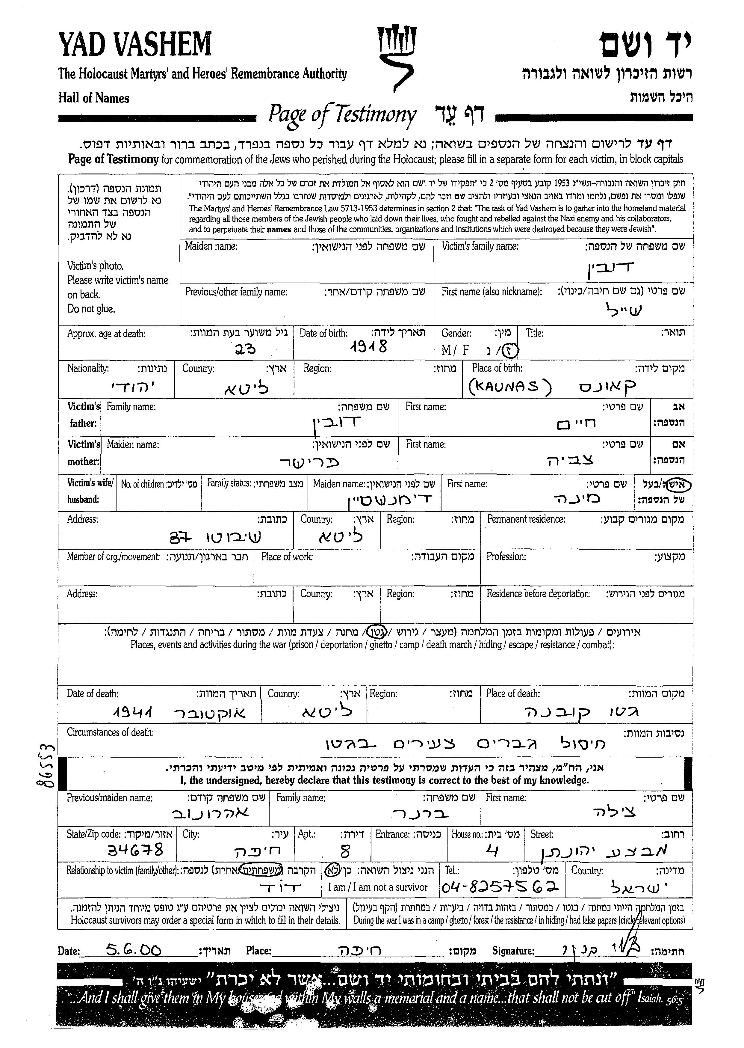 שייל נרצח בשואה. מקום המוות: Kovno שבליטא בשנת 1941.