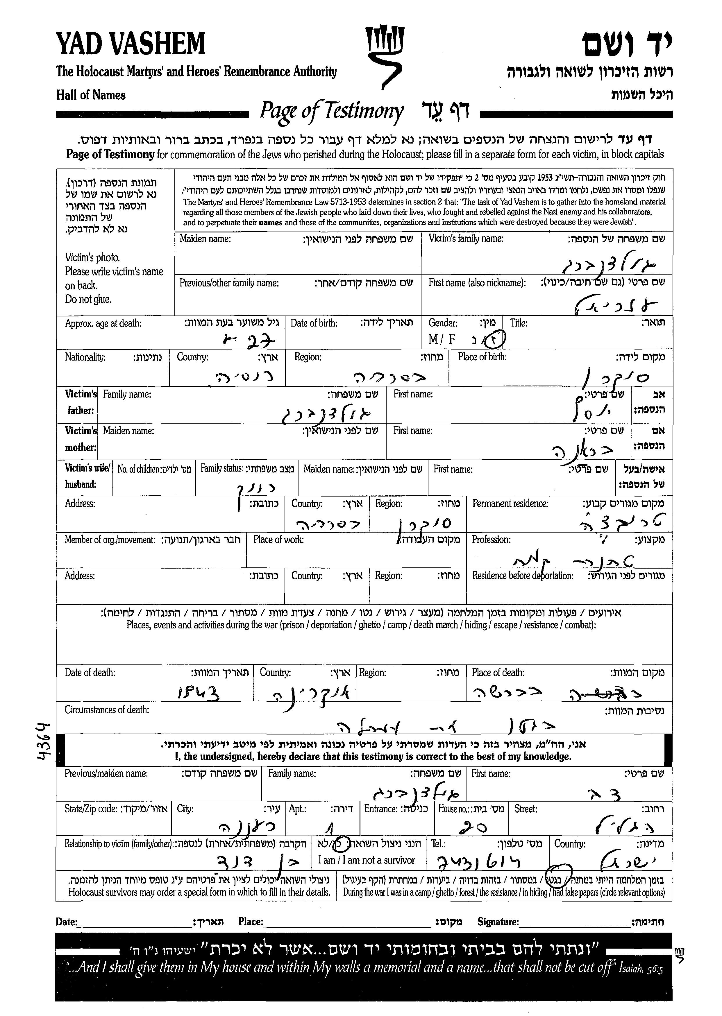 עזריאל גולדנברג נולד בSacareni שברומניה ליוסף ובראנה. הוא היה רווק. לפני מלחמת העולם השניה התגורר בTrihatchi שברומניה. עזריאל נרצח בשואה. מקום המוות: Berşad שבאוקראינה (ברה"מ) בשנת 1943.