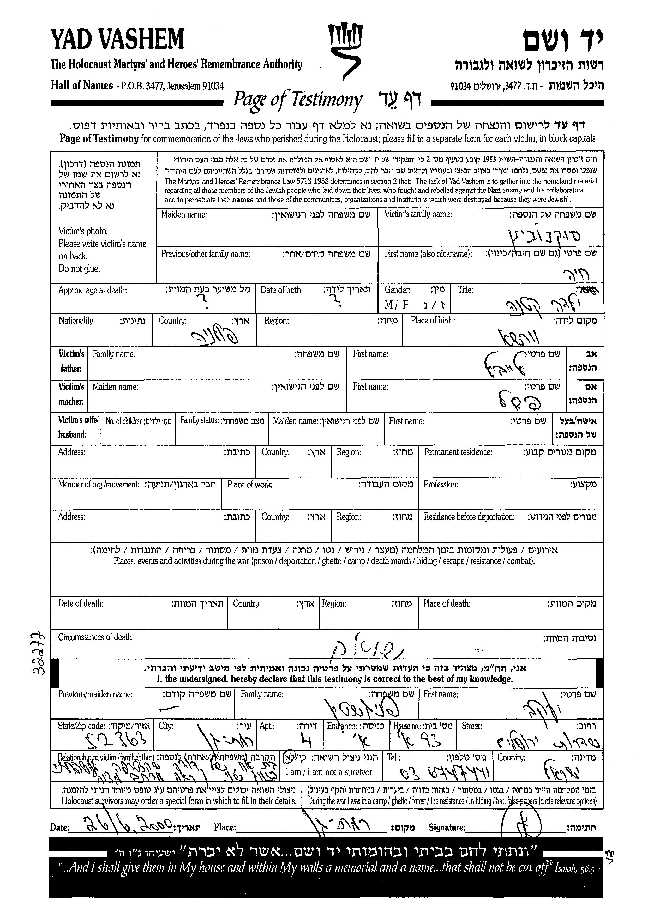 סוקנוביץ חיה מקום לא רשום, דף-עד