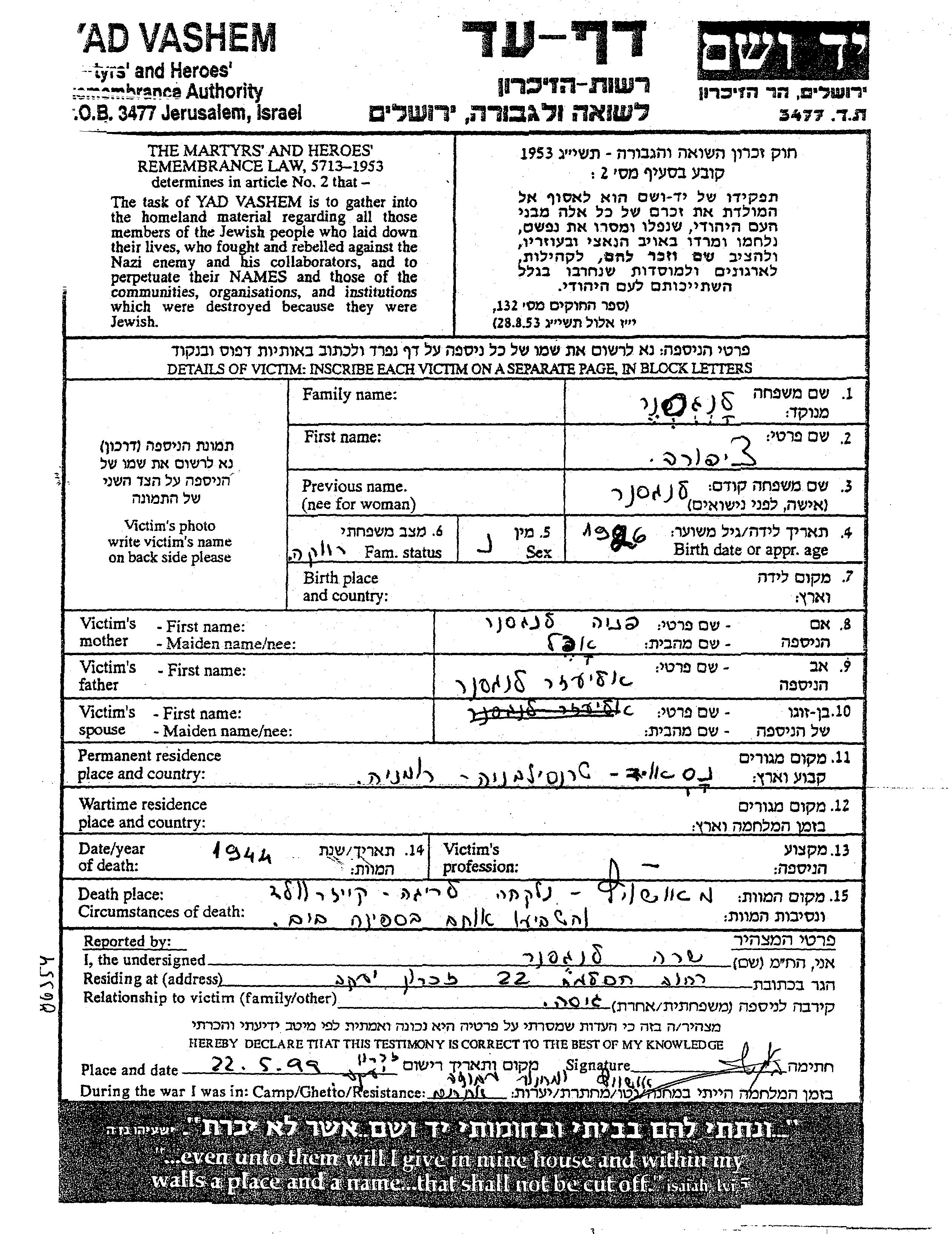 ציפורה לנגסנר נולדה בשנת 1926 לאליעזר ופניה. היא היתה רווקה. לפני מלחמת העולם השניה התגוררה בNasaud שברומניה. ציפורה נרצחה בשואה. מקום המוות: לא ידוע בשנת 1944.